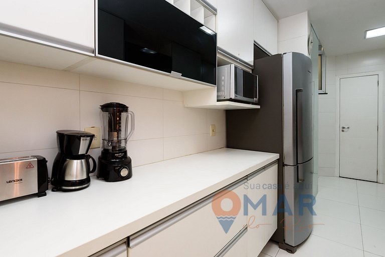 Kitchen: stove, fridge, oven, microwave, water purifier, coffee maker, blender and utensils.