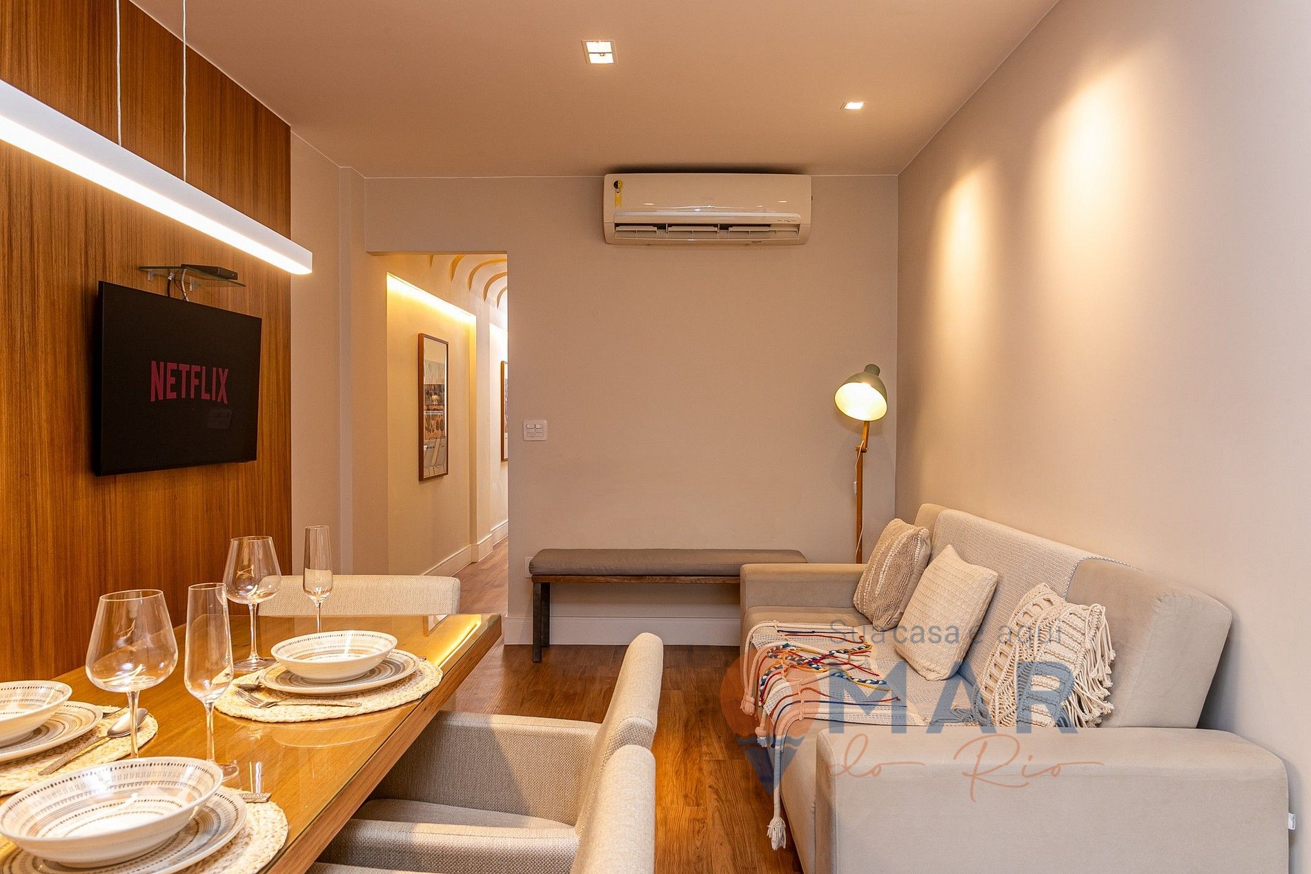 Living room: sofa bed (204cm x 187cm) with pillow top, split air conditioning, 43" smart TV with open channels (Claro), dining table with seats, footstool, and mirror.