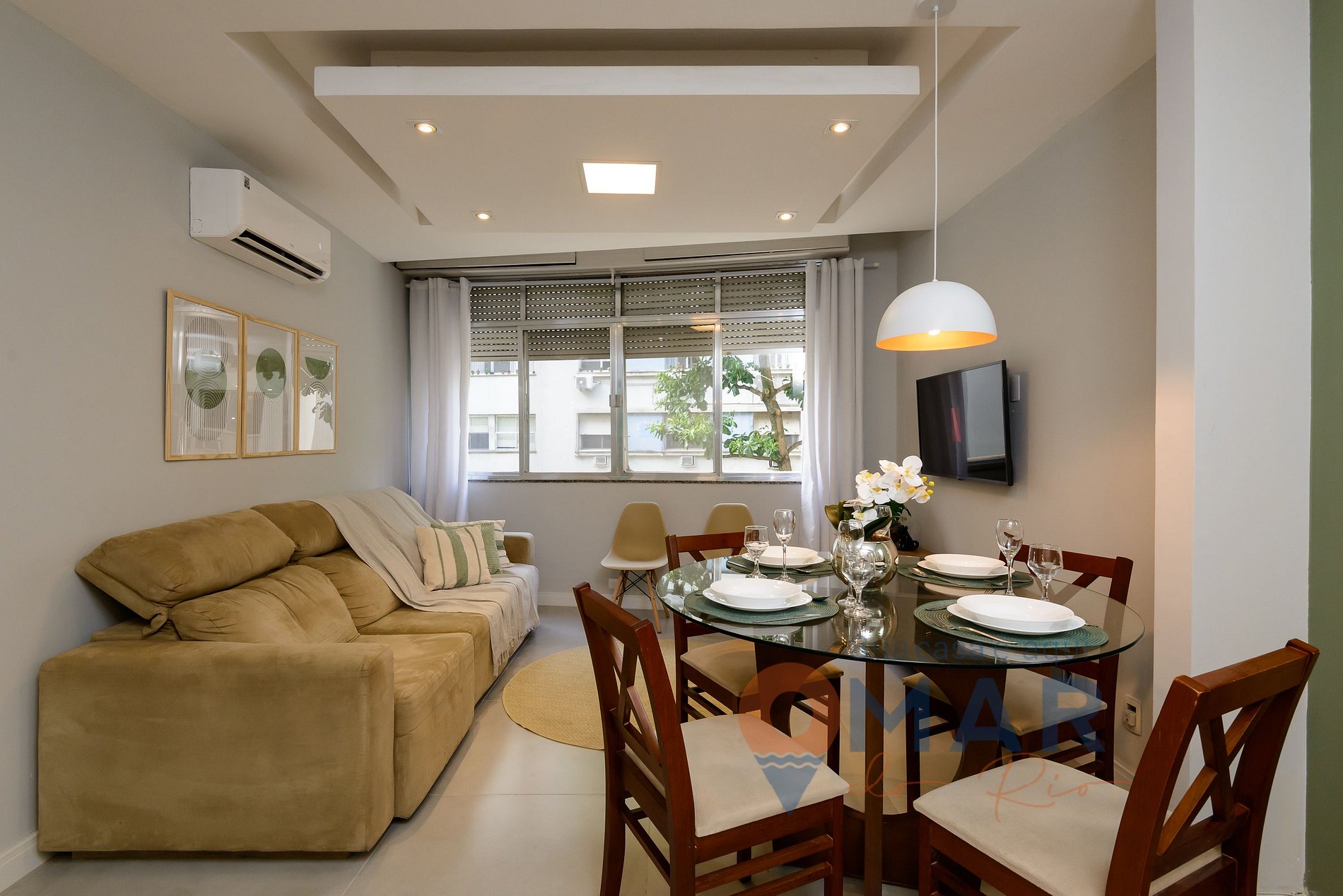 Living room: Sofa, 43'' Smart TV with cable channels (Claro TV), split air conditioning, full-length mirror, and dining table + chairs.