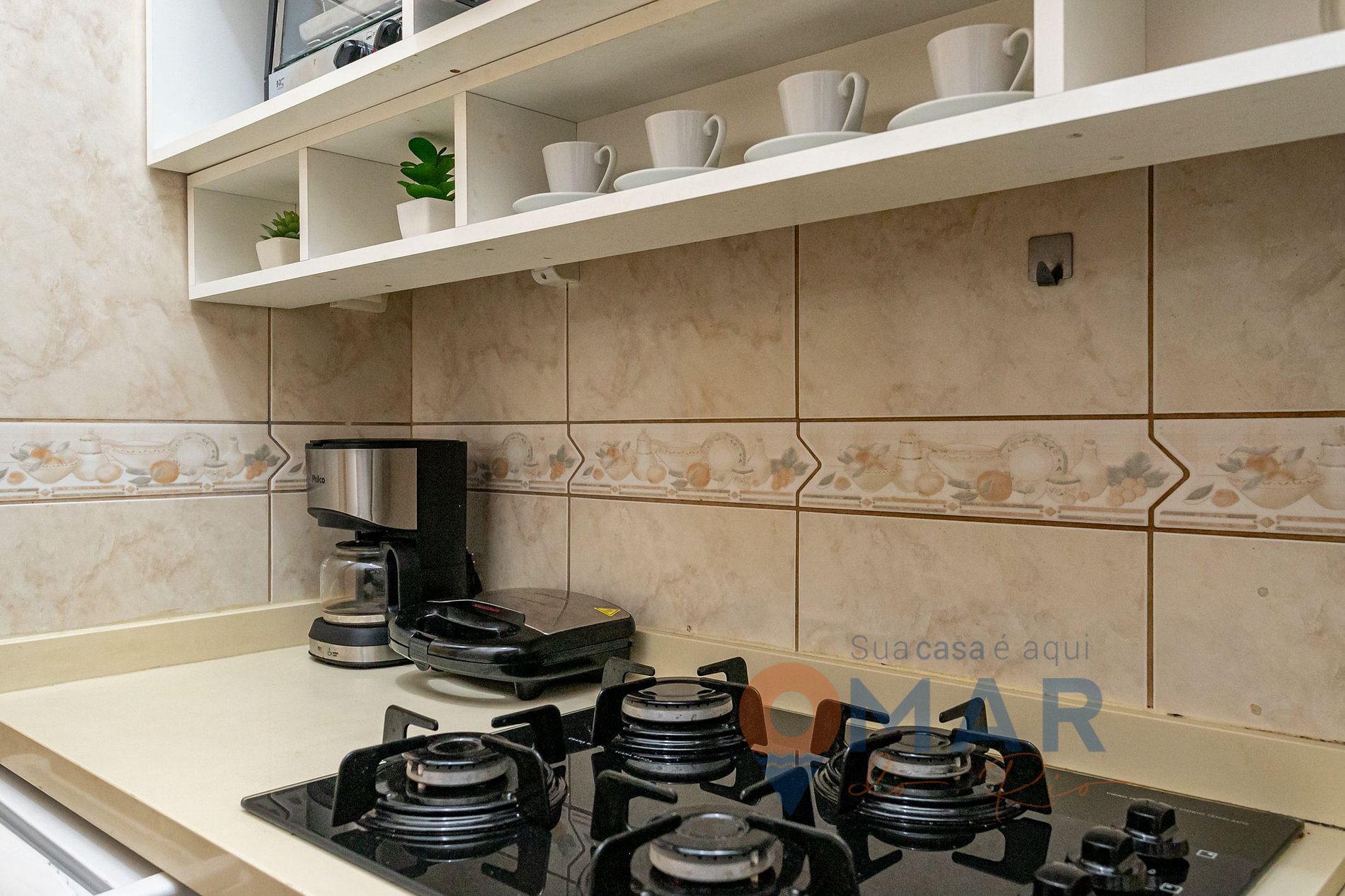 Kitchen: mini-fridge, 4-burner cooktop, electric oven, microwave, tap filter with natural water, blender, electric coffee maker and Nespresso machine, sandwich maker, and cooking utensils.