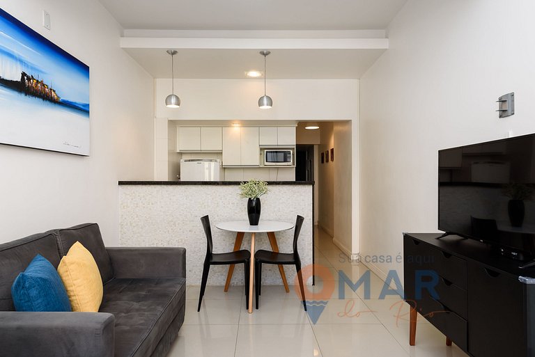 Copacabana is located in Rio de Janeiro's stunning South Zone and is widely recognized for its beautiful beach and exuberant promenade lined with black and white Portuguese stones that form a mosaic in the shape of ocean waves. In addition to this natural beauty, a variety of conveniences await just a few steps away, including markets, pharmacies, restaurants, snack bars and bars, making your stay even more comfortable and practical.