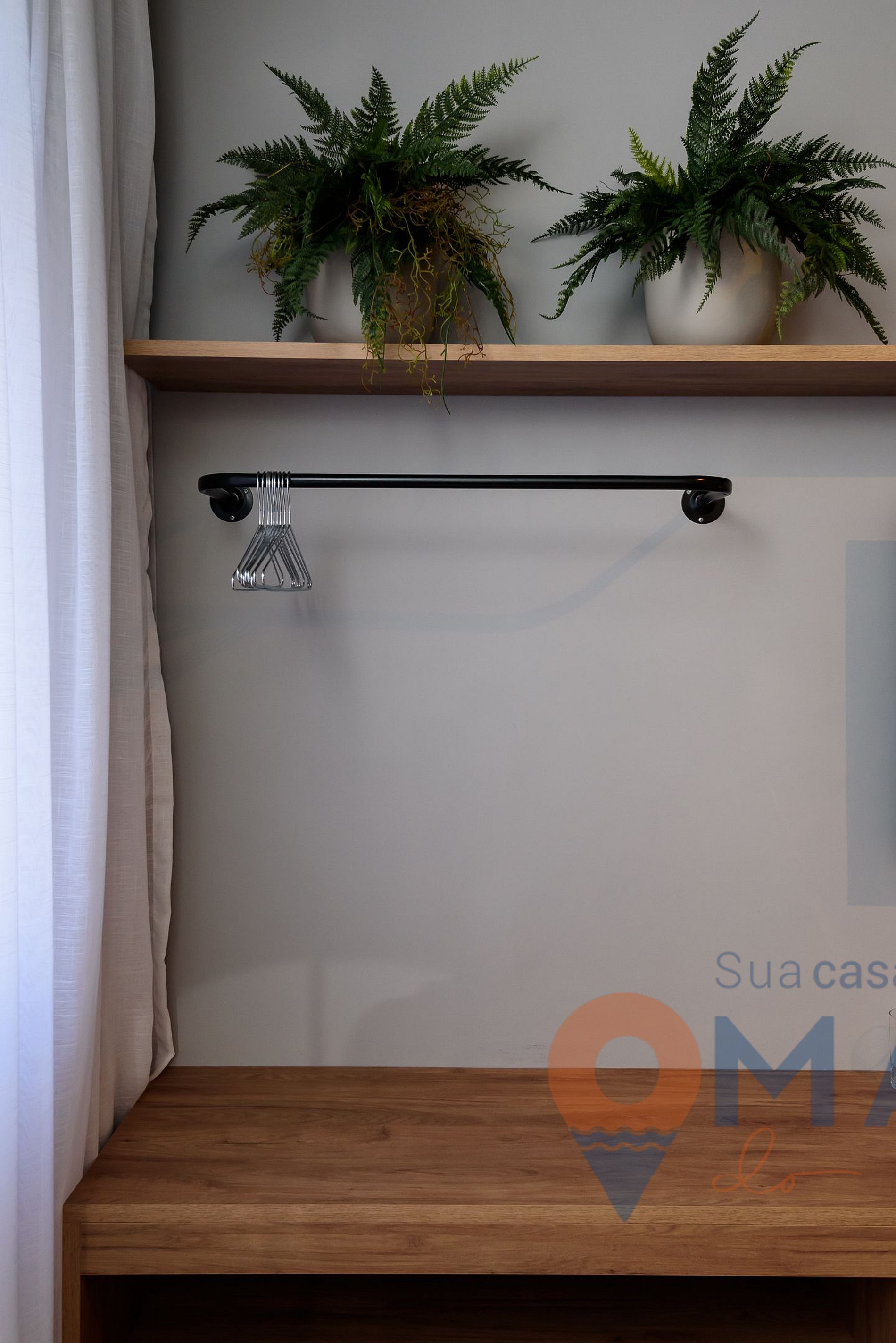 Studio: double bed (188cm x 138cm), armchair, split air conditioning, 50" Smart TV with open channels (digital antenna), clothes rack with hangers, counter with 2 seats for meals, work station, blackout and translucent curtains, and protective screen.