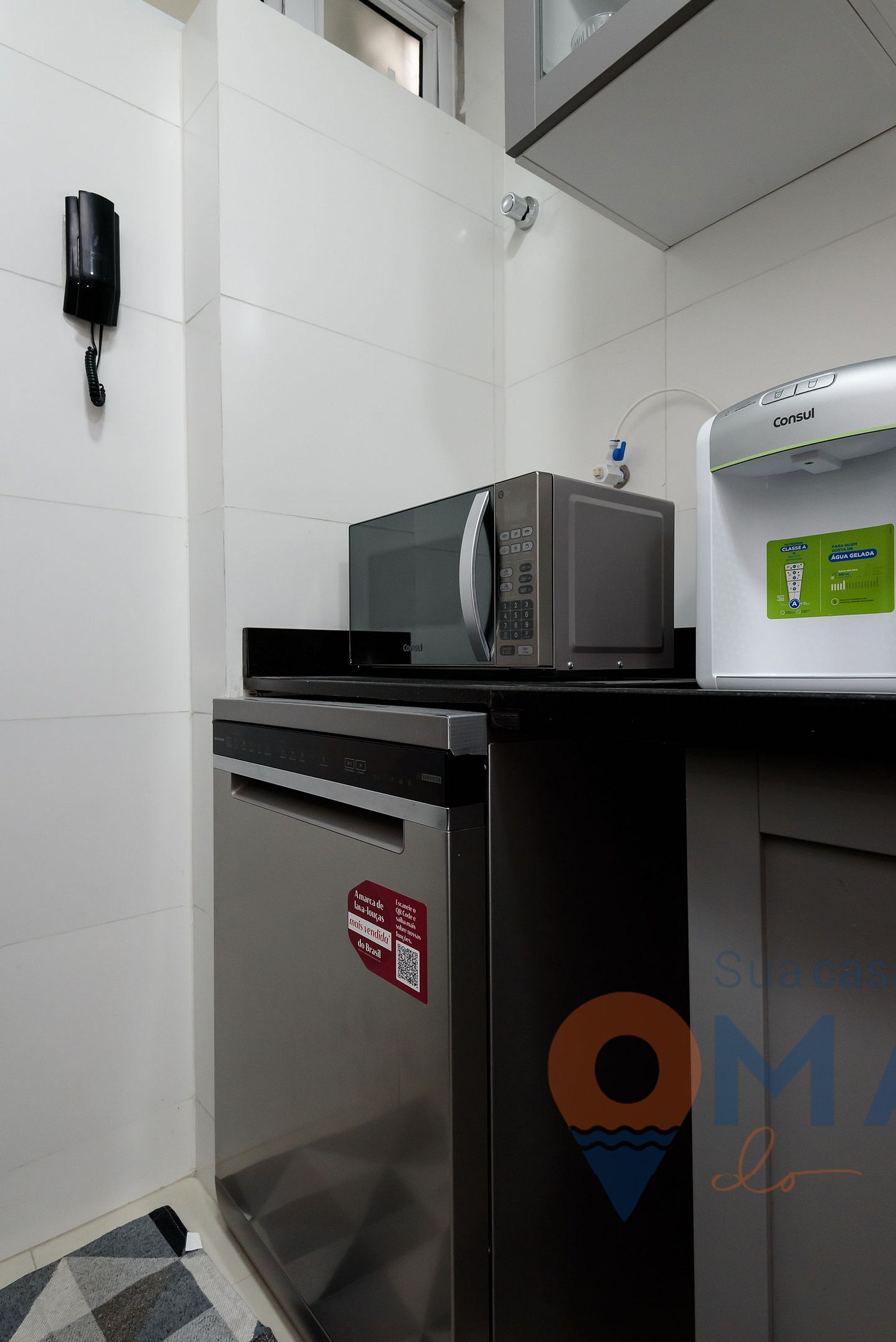 Kitchen: refrigerator, 5-burner cooktop, electric oven, microwave, electric coffee maker, kettle, blender, water purifier (natural and cold water), sandwich maker, dishwasher, and cooking utensils.