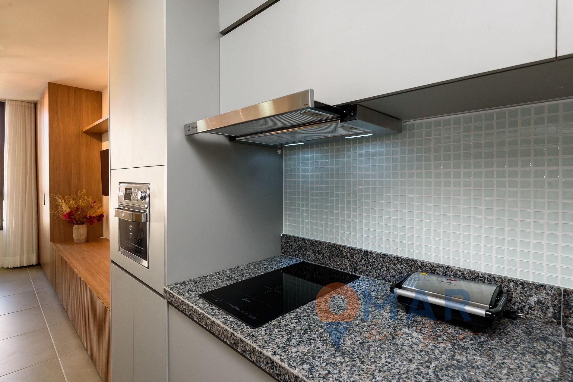 Kitchen: minibar, 2-burner cooktop stove, electric oven with air fryer function, microwave, water purifier with natural and cold water, sandwich maker, Nespresso coffee maker, electric kettle, mixer, and cooking utensils.