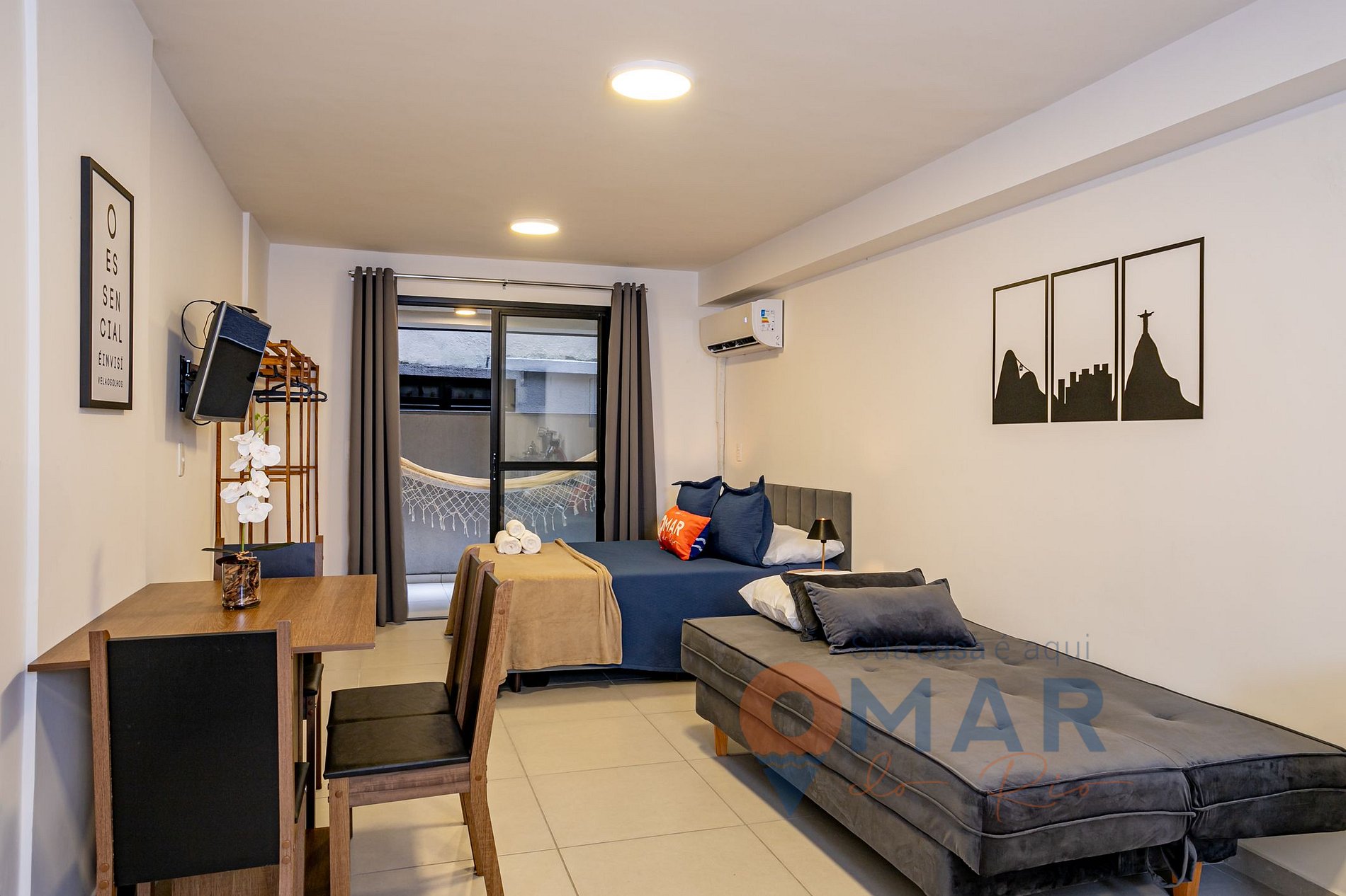 Studio: double bed (188cm x 138cm), sofa bed (120cm x 190cm), 32" TV with streaming device and access to Globo channels via Globoplay, split air conditioning, blackout curtains, clothes rack with hangers, full-length mirror, hammock, and dining table with seats.