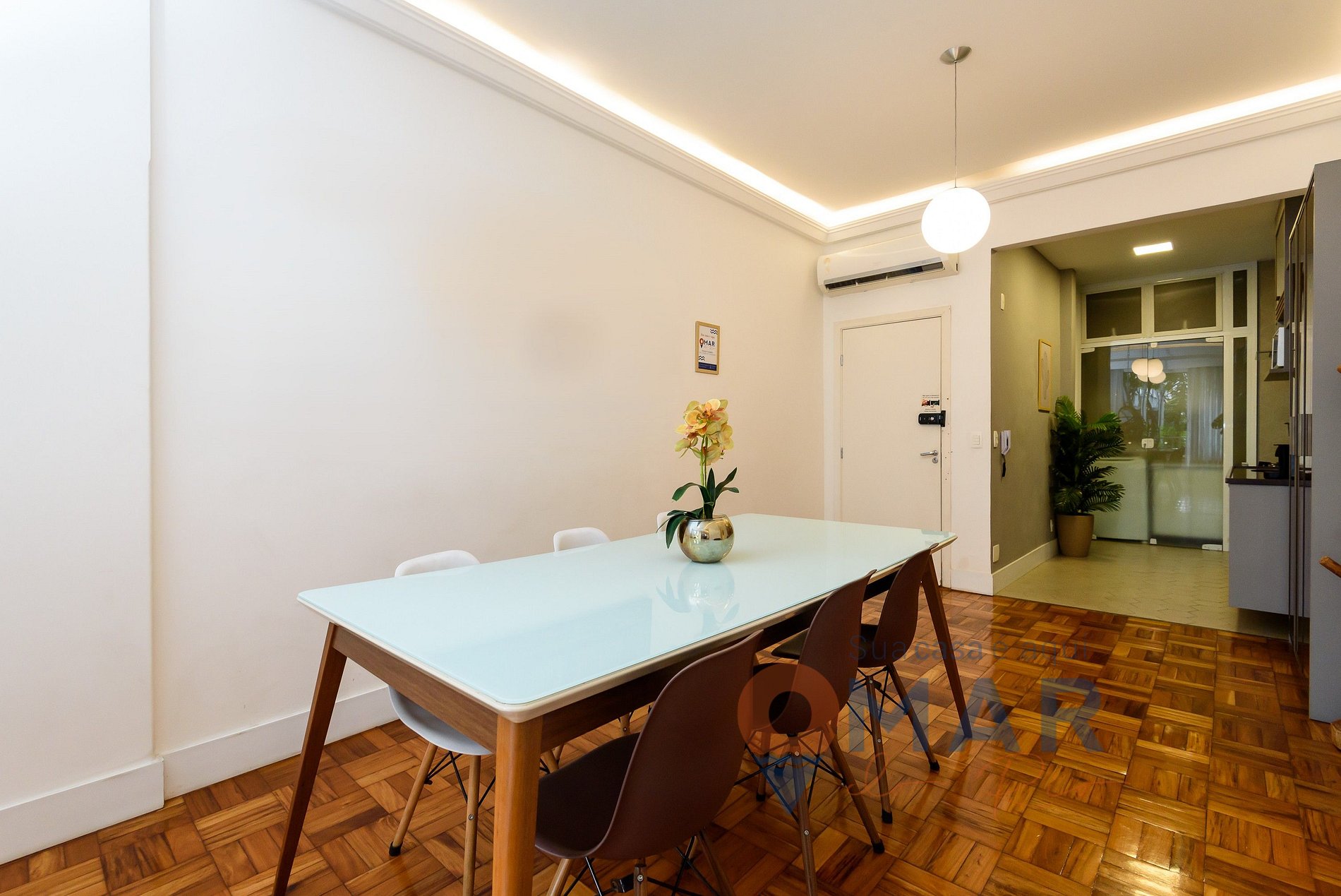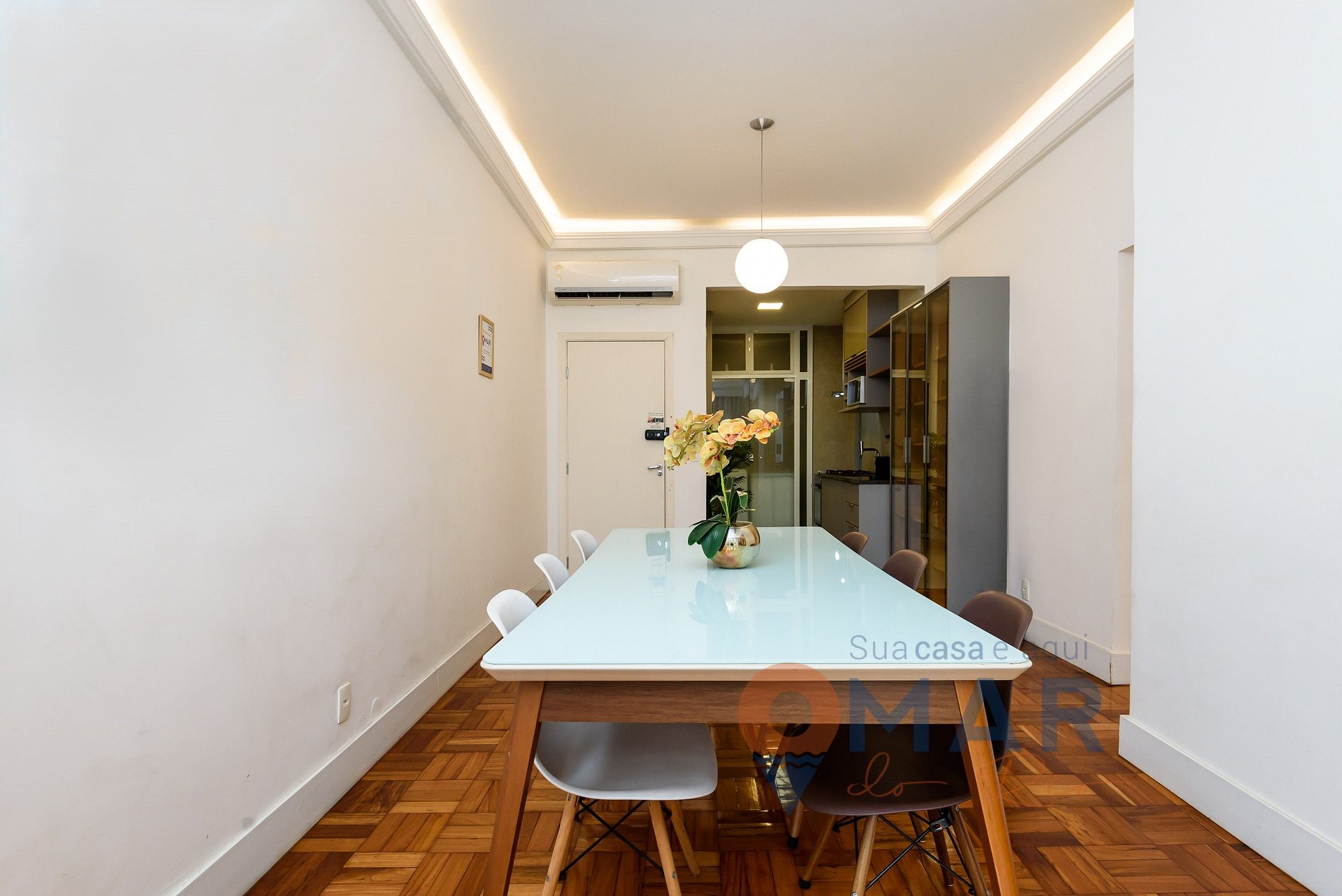 Dining Room: dining table with 6 chairs, split air conditioning, and curtains.
