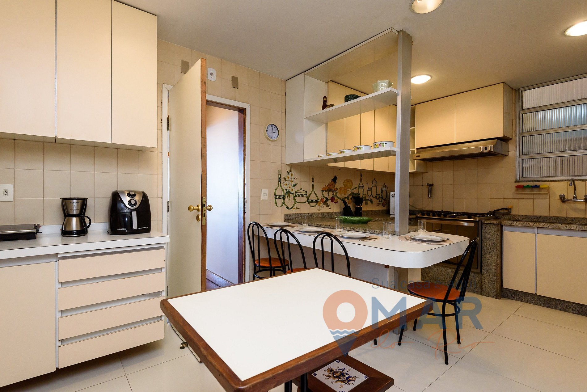 Kitchen: Refrigerator, auxiliary freezer, 5-burner stove with oven, coffee maker, blender, microwave, air fryer, water purifier (for natural and chilled water), sandwich maker, counter with chairs, and kitchen utensils.