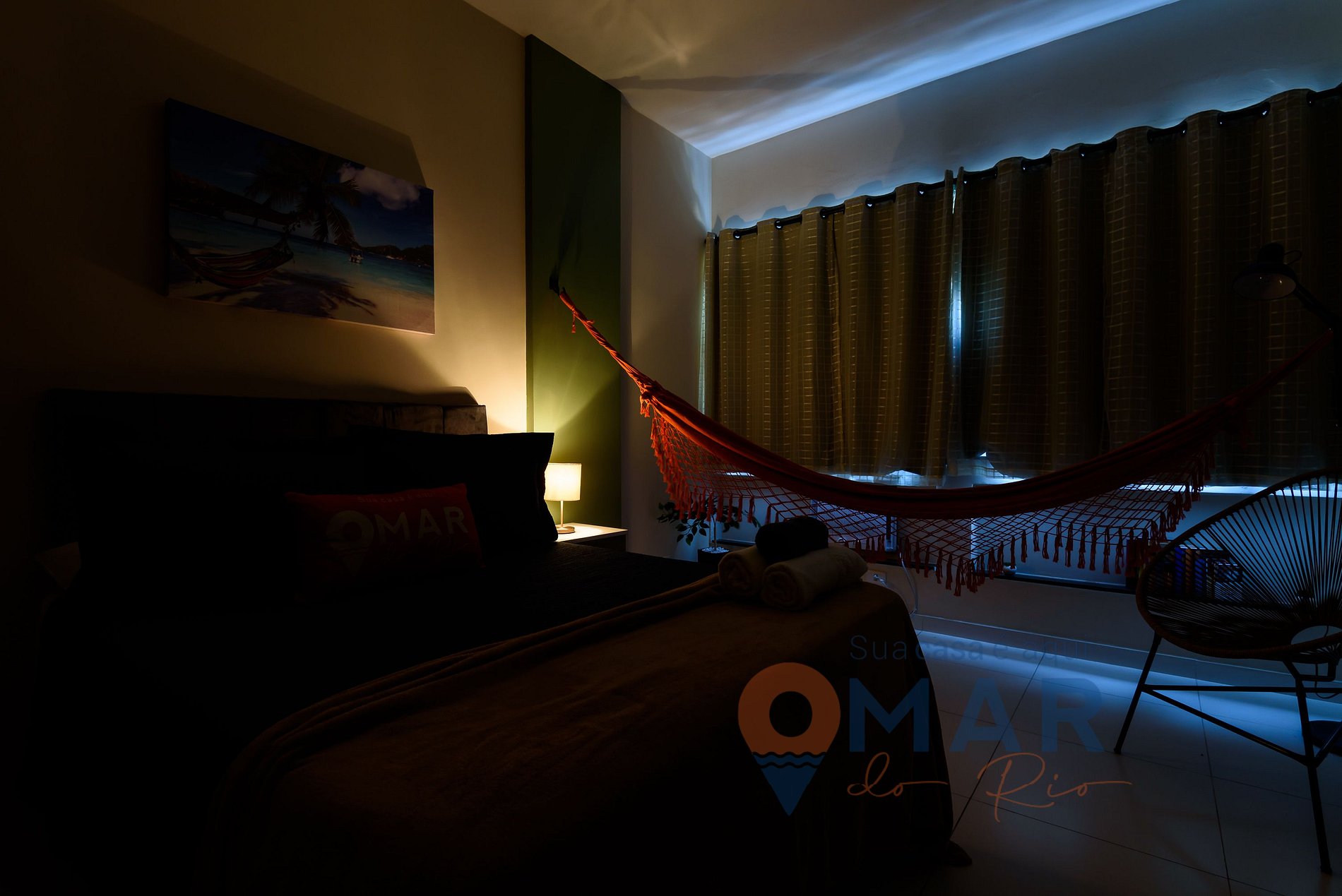 Bedroom: standard double bed (188cm x 138cm), air conditioning, blackout curtain, closet with hangers, 50” smart TV with free-to-air channels, reading area with Acapulco chair and lamp, hammock and full-length mirror.