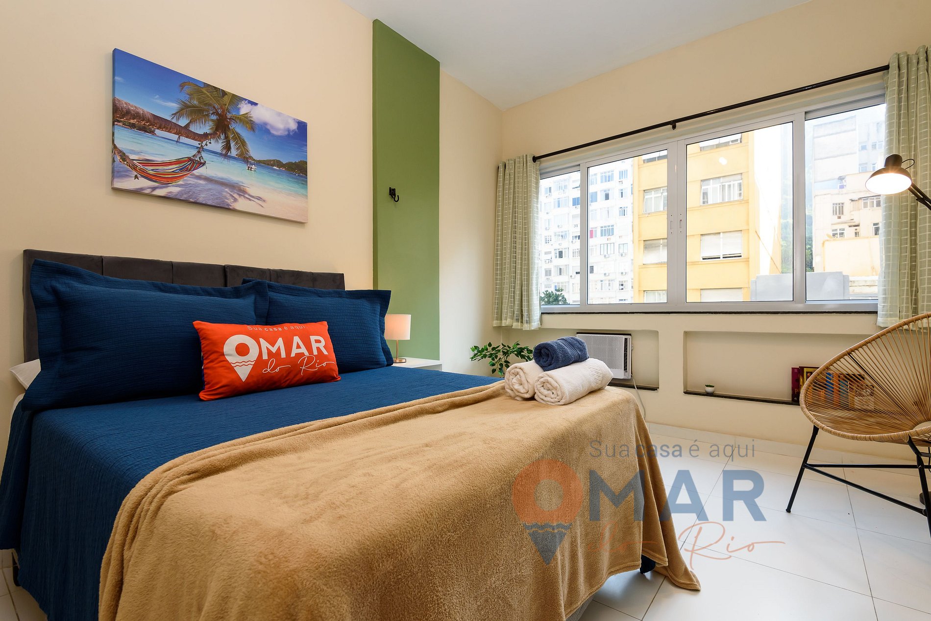 Bedroom: standard double bed (188cm x 138cm), air conditioning, blackout curtain, closet with hangers, 50” smart TV with free-to-air channels, reading area with Acapulco chair and lamp, hammock and full-length mirror.