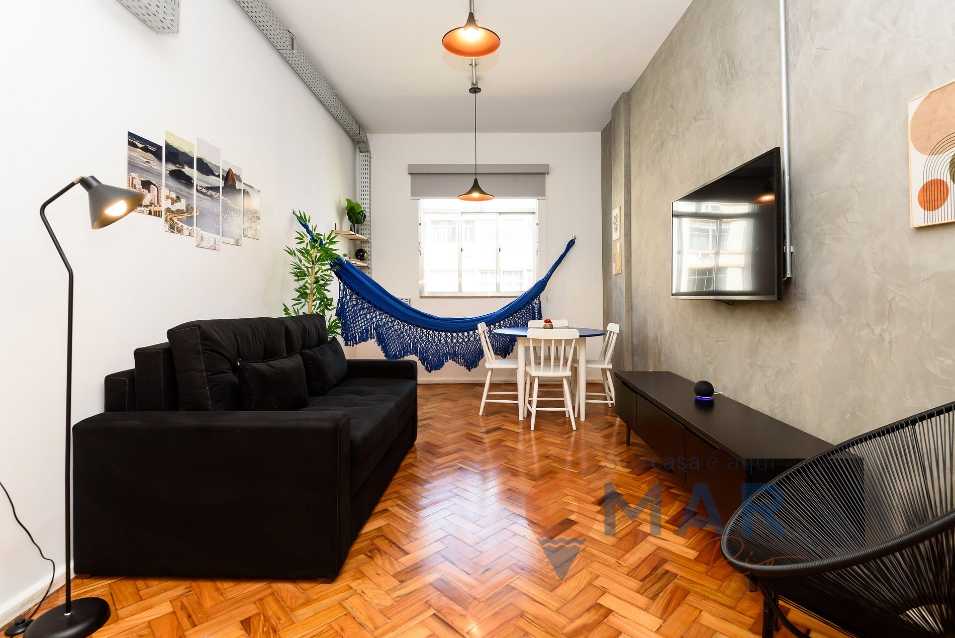 Living room: double sofa bed, split air conditioning, table + 4 chairs, 65” smart TV, blackout roller blind and hammock.
