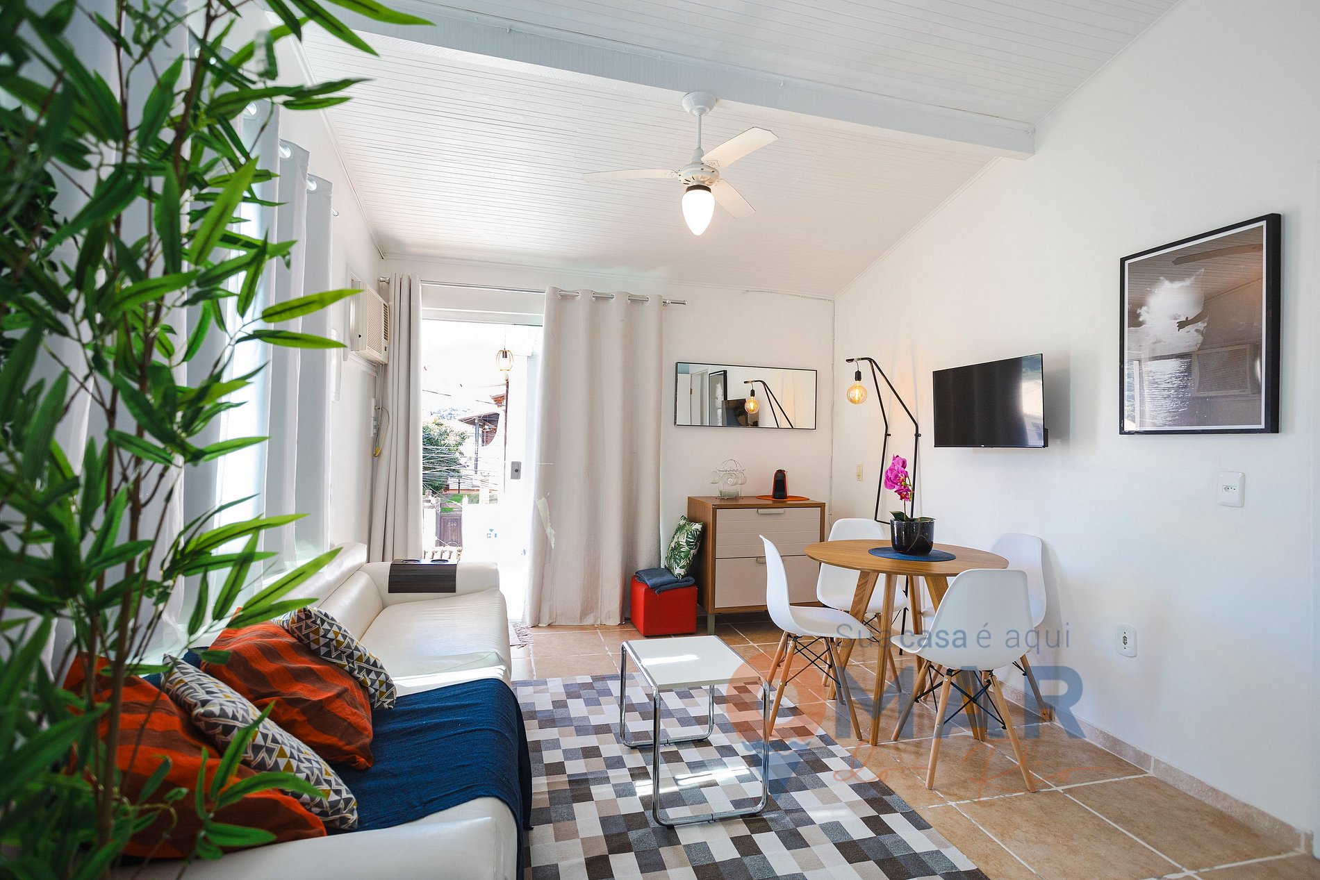 Living room: sofa, TV, air conditioning, ceiling fan and dining table with seats.