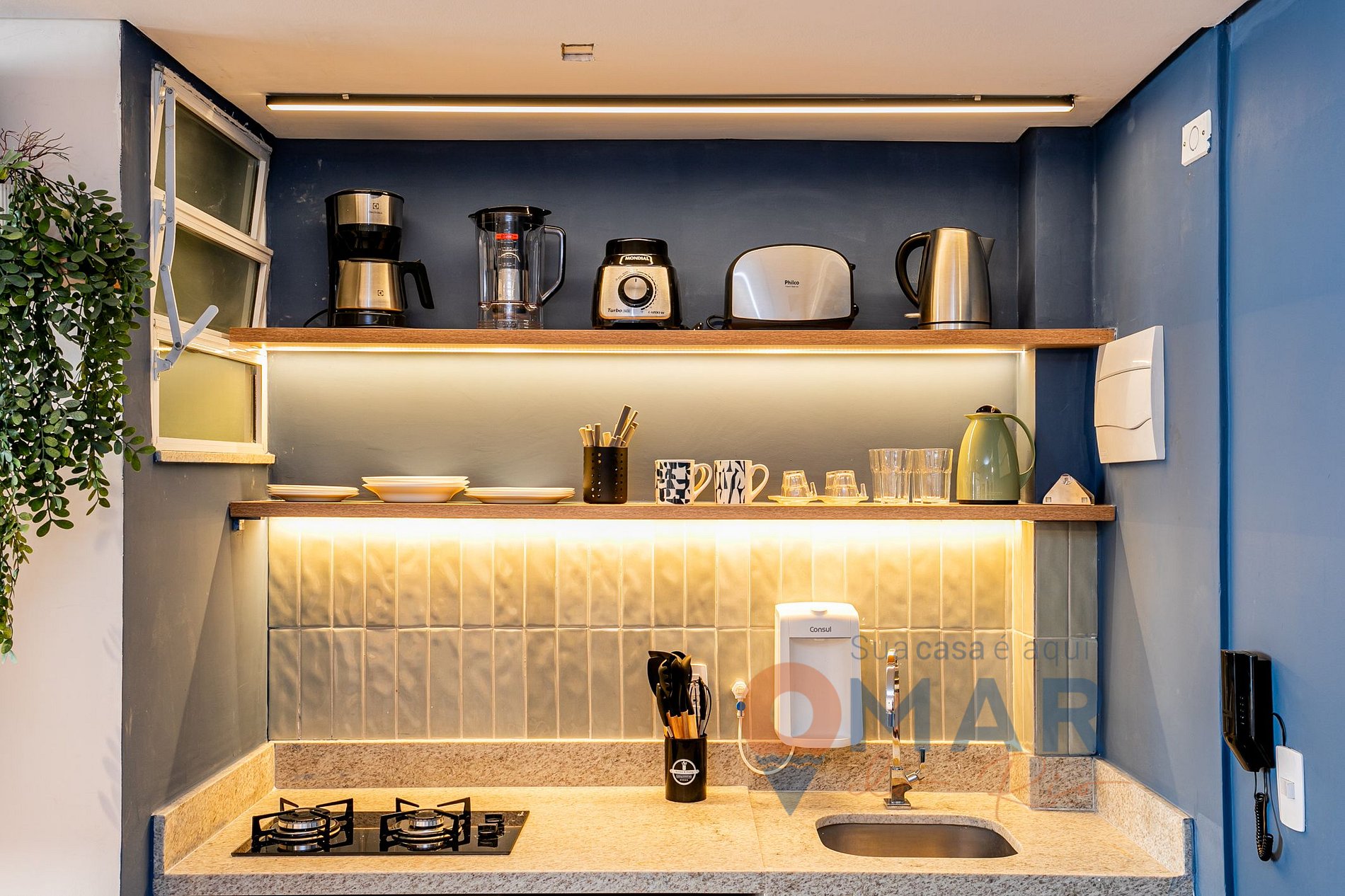 Kitchen: Minibar, cooktop stove, microwave, blender, toaster, pans, water filter, coffee maker and kitchen utensils.