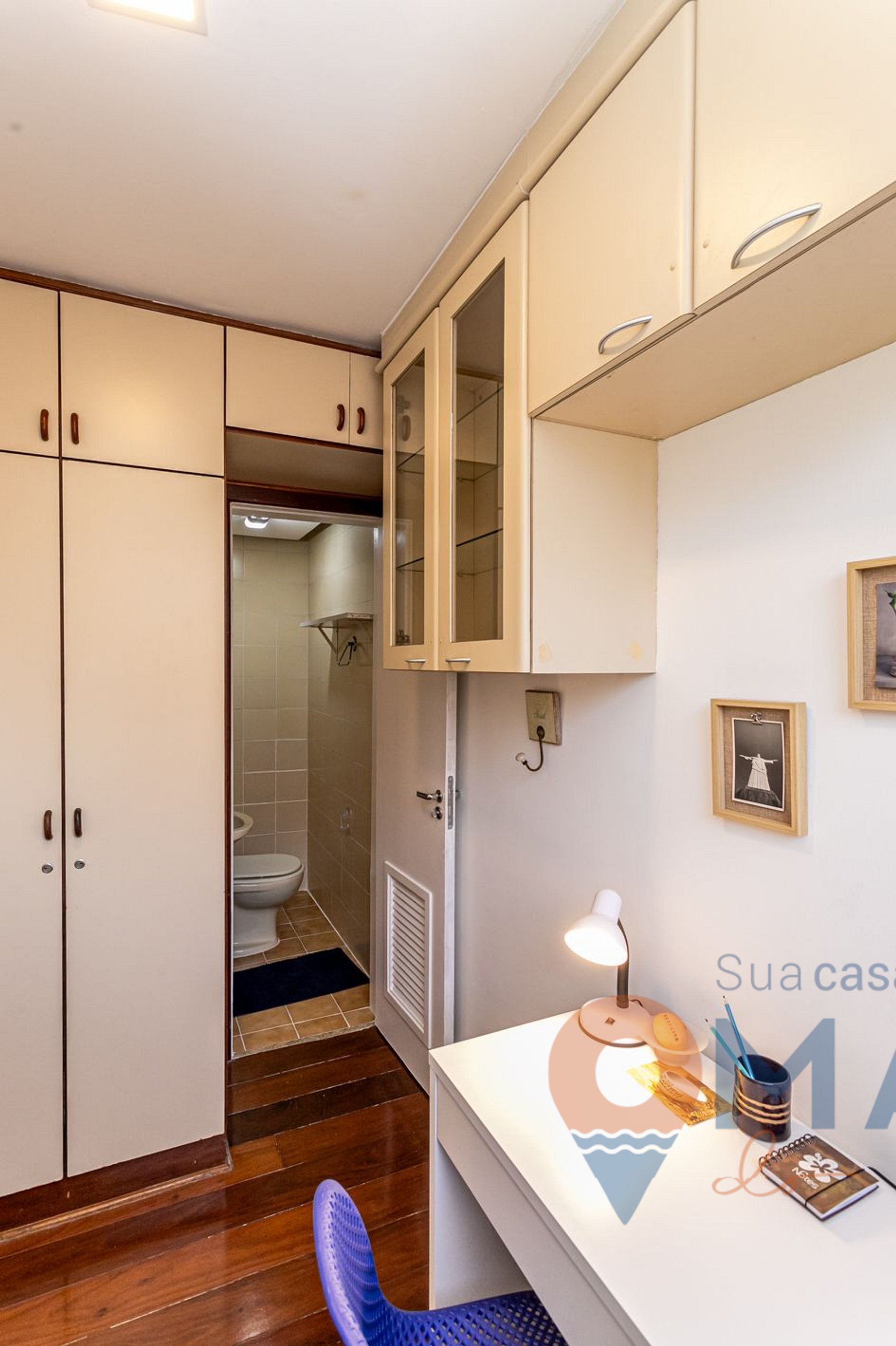 Office: desk, chair, lamp, floor fan and cupboards.
