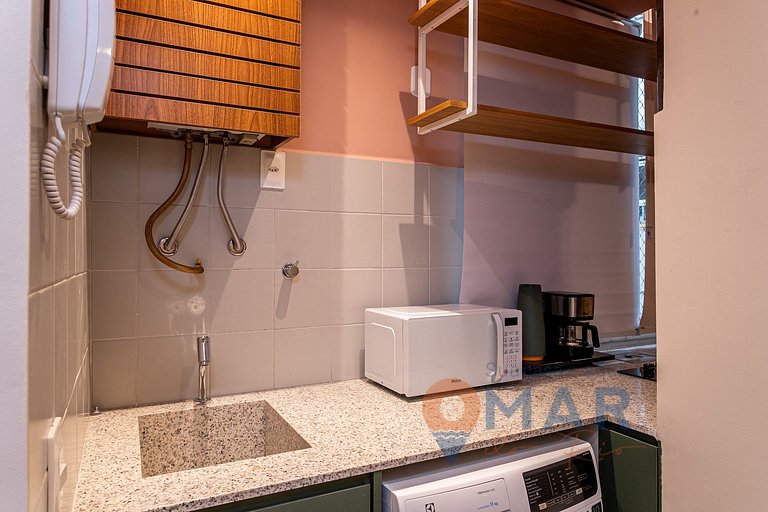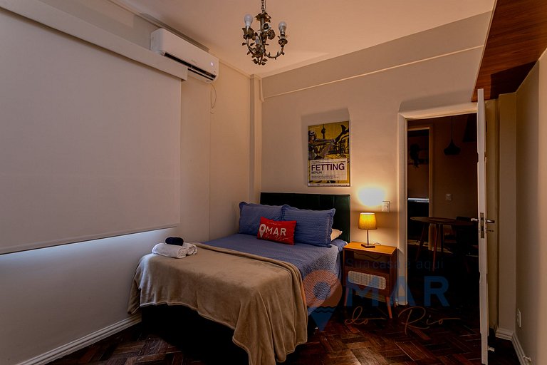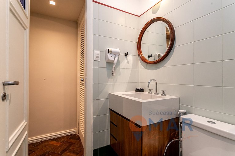 Modern, well-equipped 1-bedroom apartment in Copacabana. Available with 500mbps internet, air conditioning, washing machine. The kitchen integrated into the living room, with its elegant vintage design, combines beauty and functionality, as well as being equipped with quality appliances and utensils. Located just 450m from the iconic Copacabana Beach and 120m from the Cardeal Arcoverde Metro Station, providing easy access to the city's main tourist attractions.