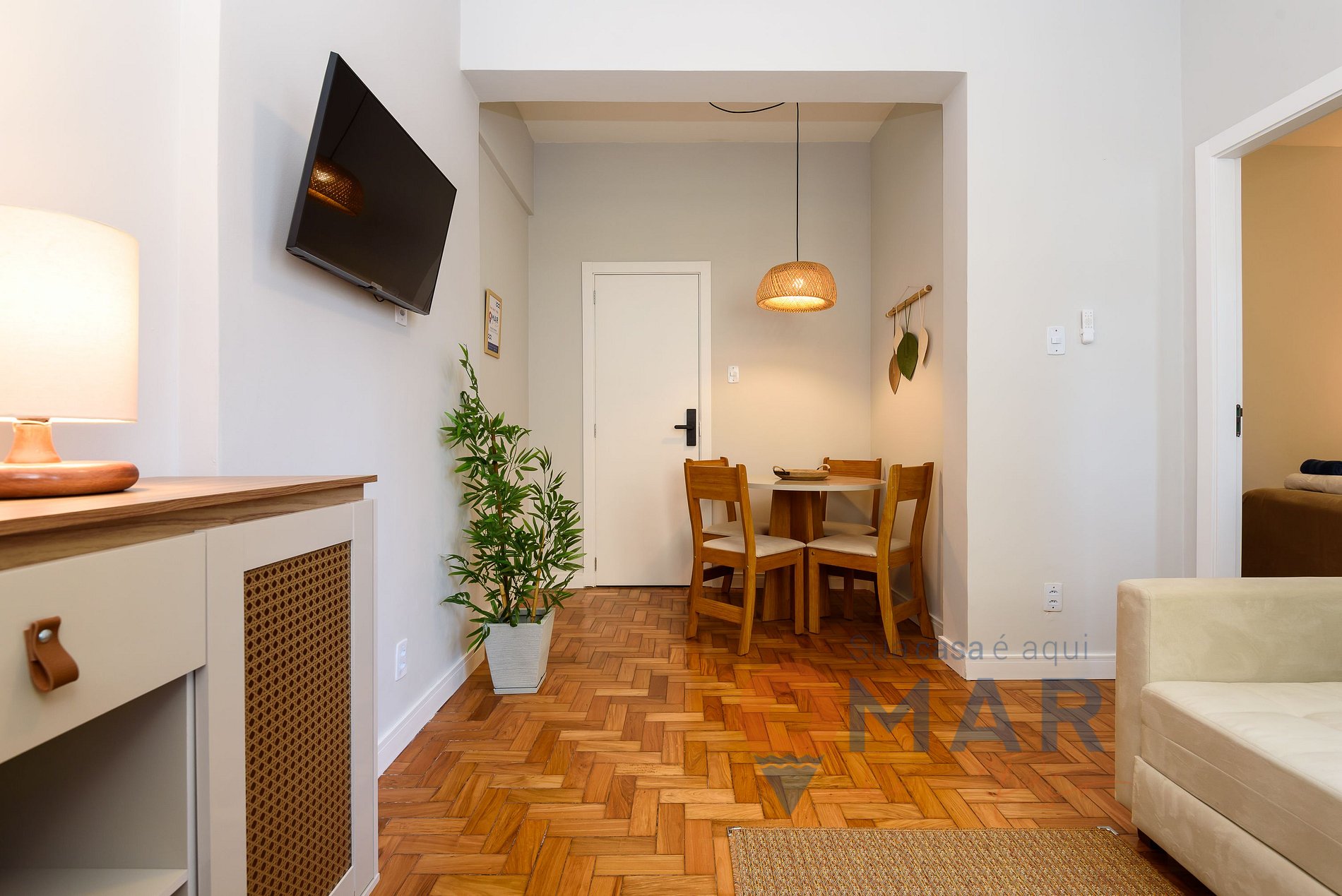Living room: sofa, Smart TV with cable channels (NET Claro), ceiling fan with control, dining table with 4 chairs and blackout curtain.