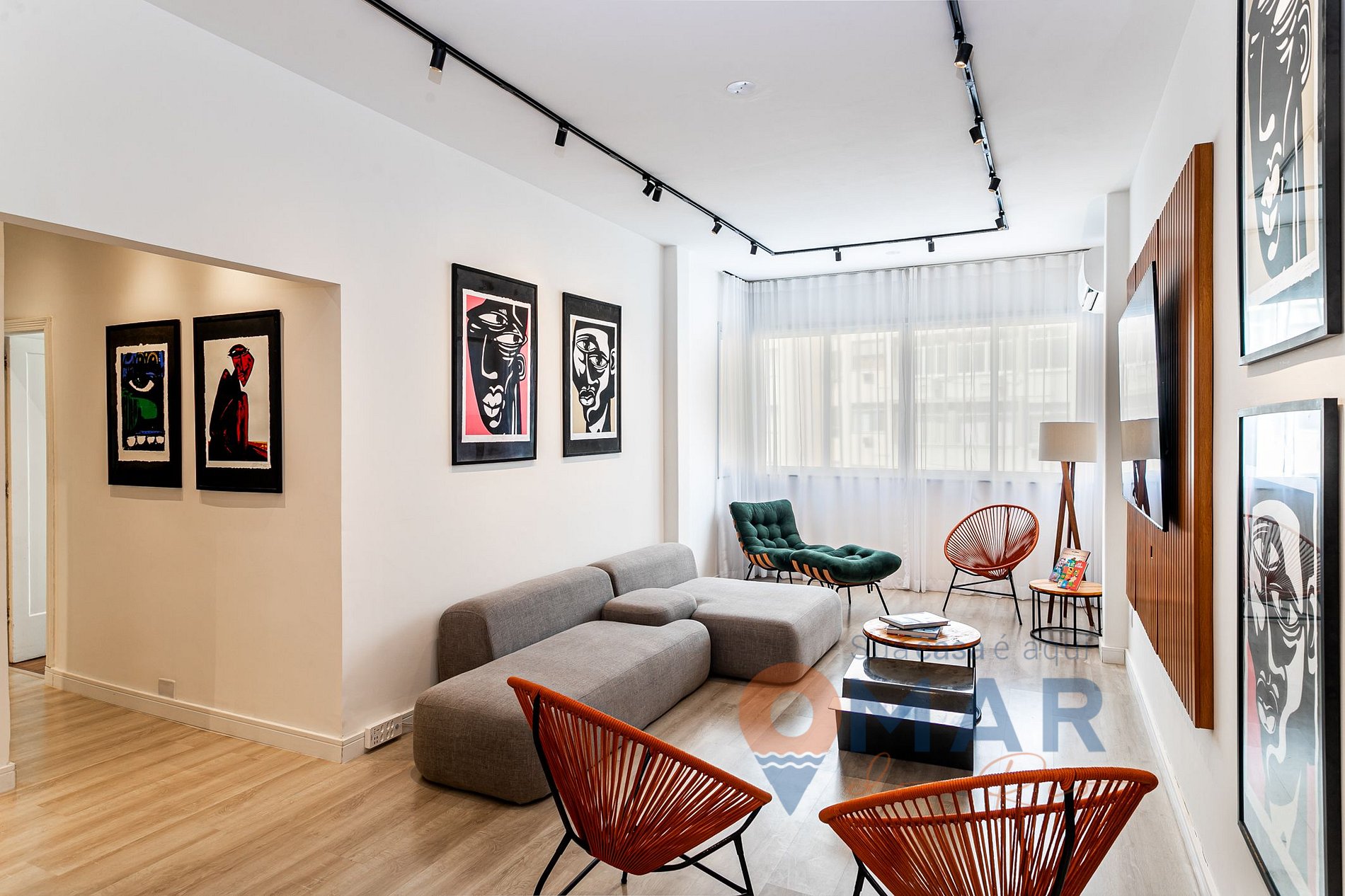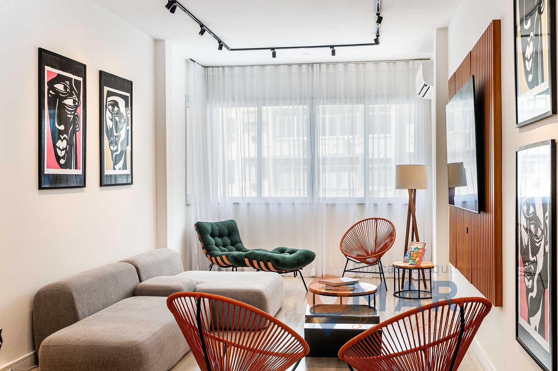 Living room: sofa, split air conditioning, Smart TV 75', armchair with puff, acapulco chair, bench with high stools and translucent curtain.