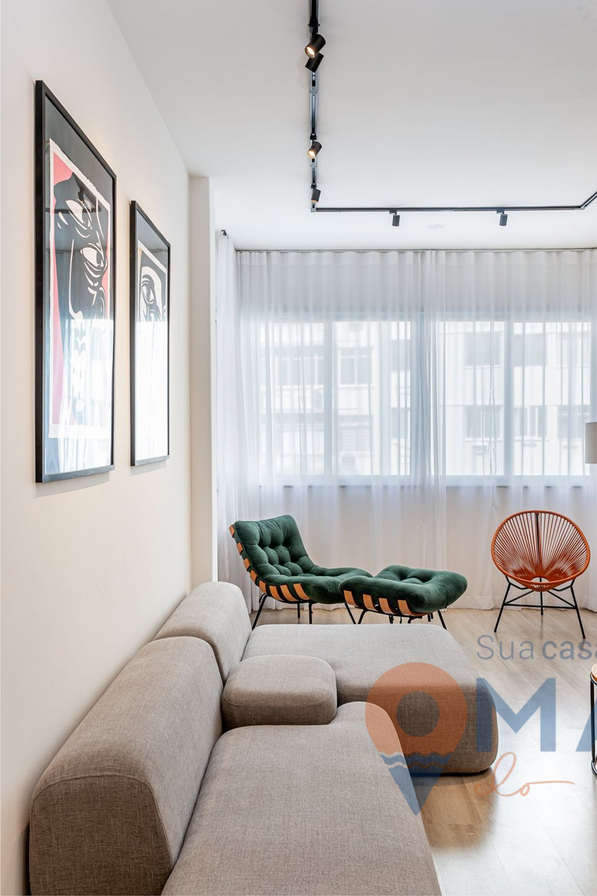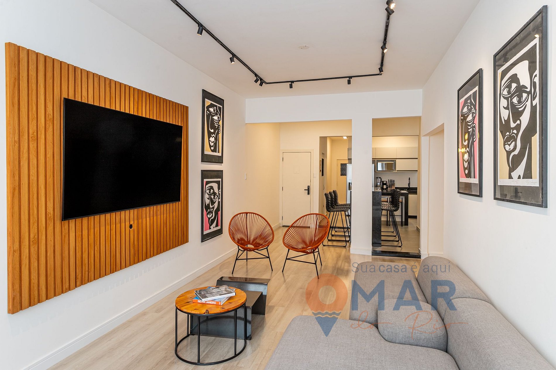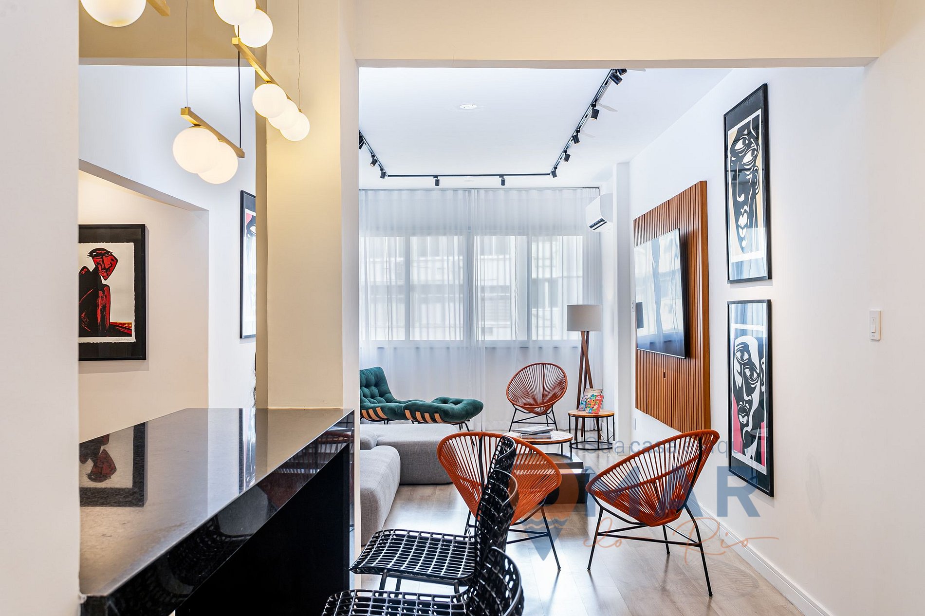 Living room: sofa, split air conditioning, Smart TV 75', armchair with puff, acapulco chair, bench with high stools and translucent curtain.
