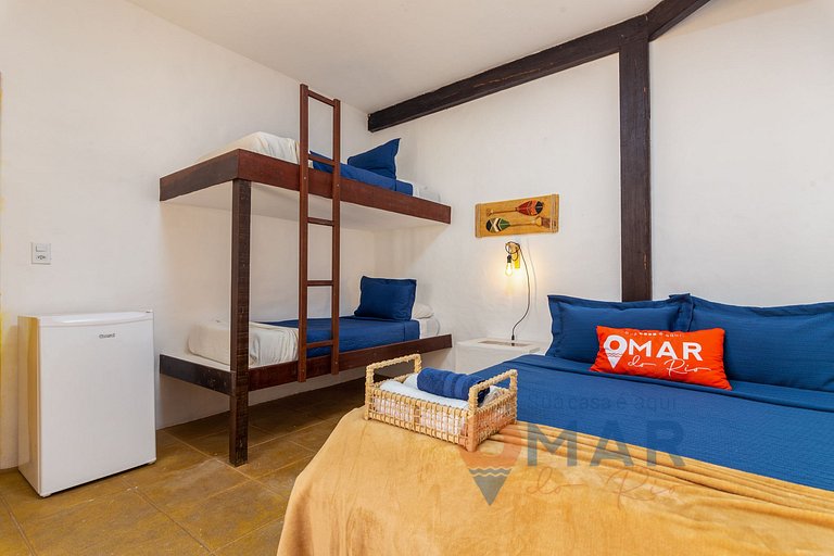 The suite is equipped with a double bed, a single bunk bed, air conditioning, minibar, Smart TV, dressing room and full-length mirror. Enjoy your private balcony in the suite, an exclusive space to relax under the Búzios sun.
