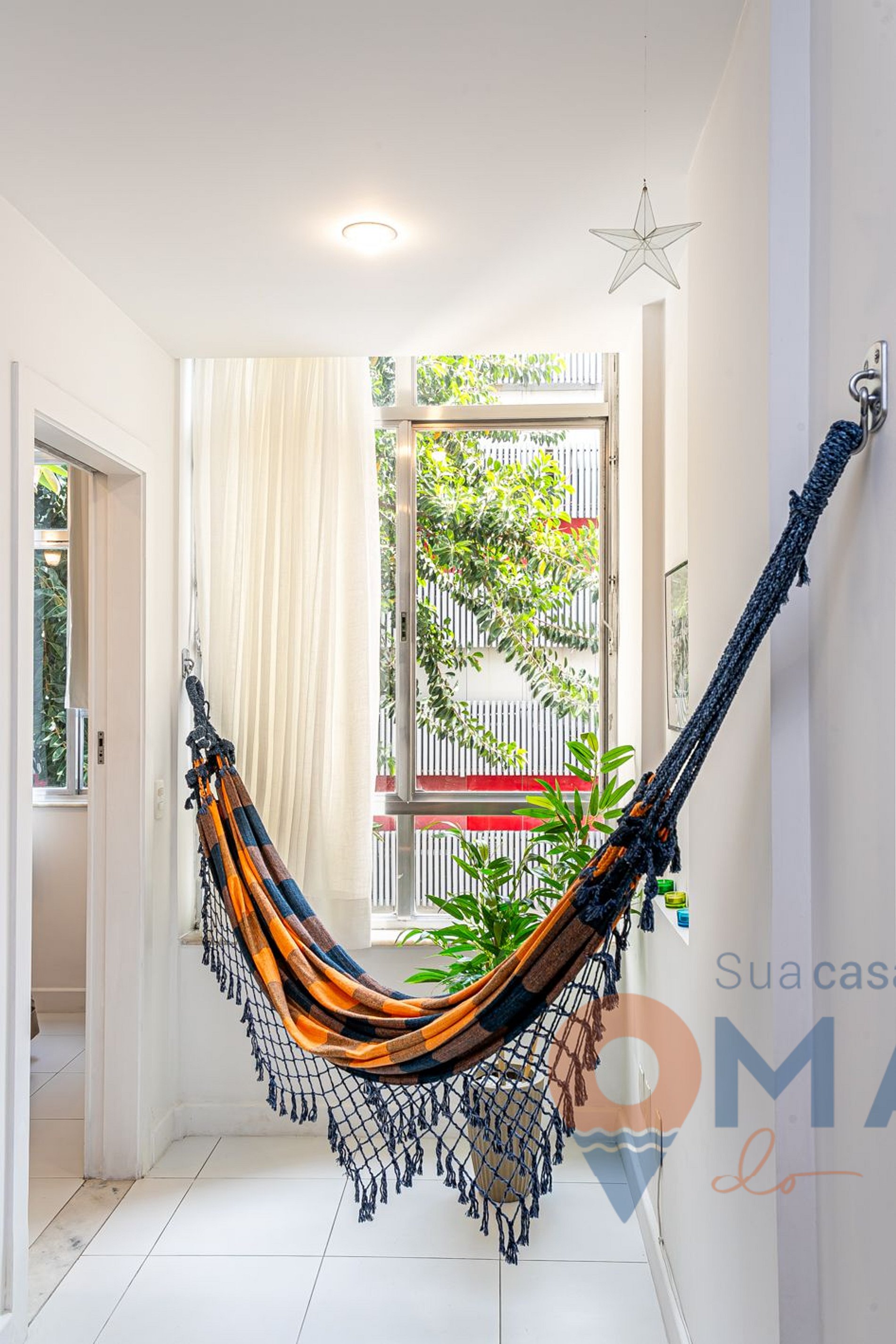 Living room: Sofa, Smart TV with cable channels from Vivo TV, floor fan, hammock and dining table + chairs.