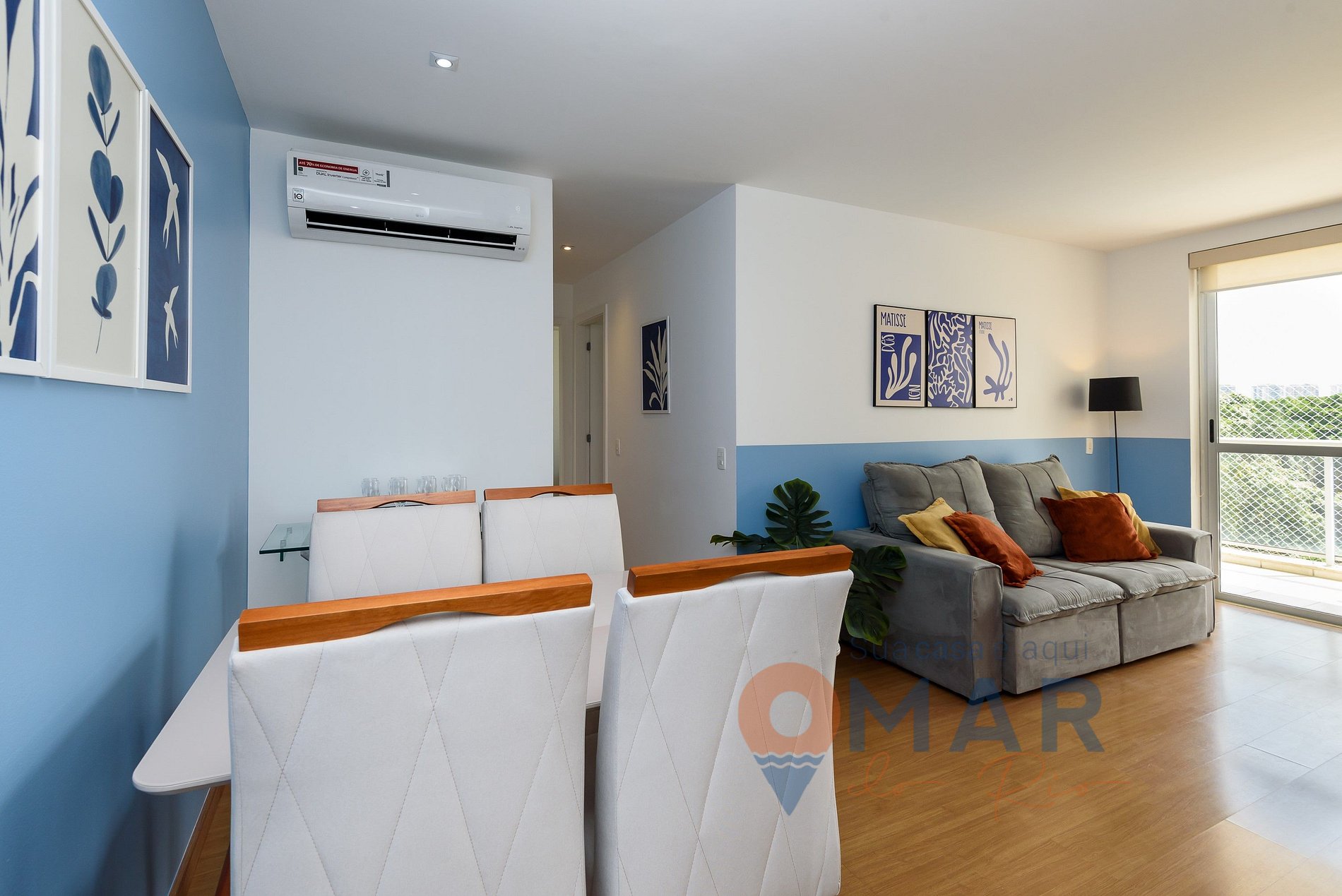 Living room: sofa, air conditioning, Smart TV with cable channels (Claro TV), dining table + seats, translucent blinds.