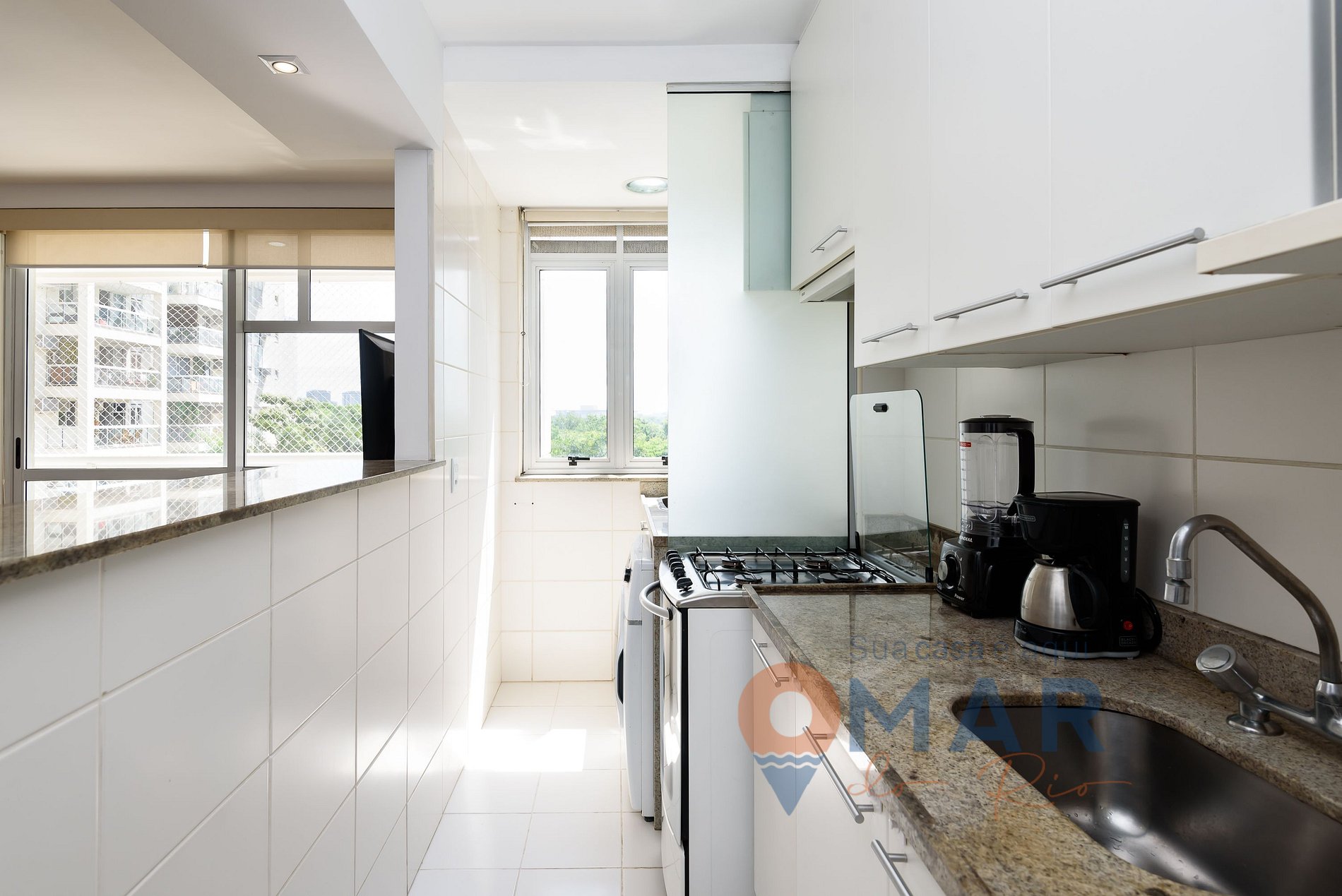 Kitchen: stove, fridge, oven, microwave, coffee maker, blender, water purifier, glasses and utensils.
