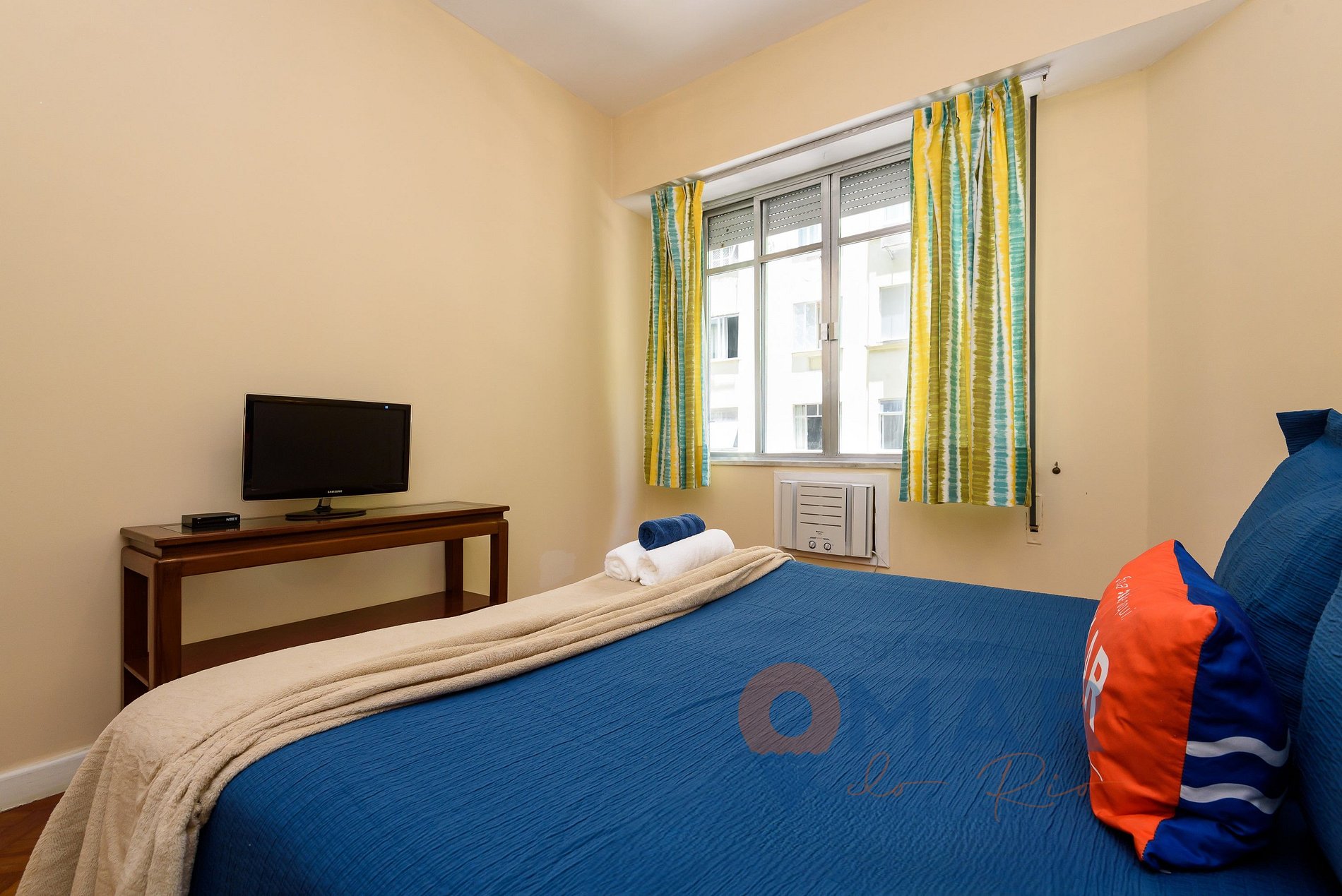 Bedroom 4: Queen bed (1.58m x 1.98cm), TV with Claro TV channels, air conditioning, blackout curtains, and closet.