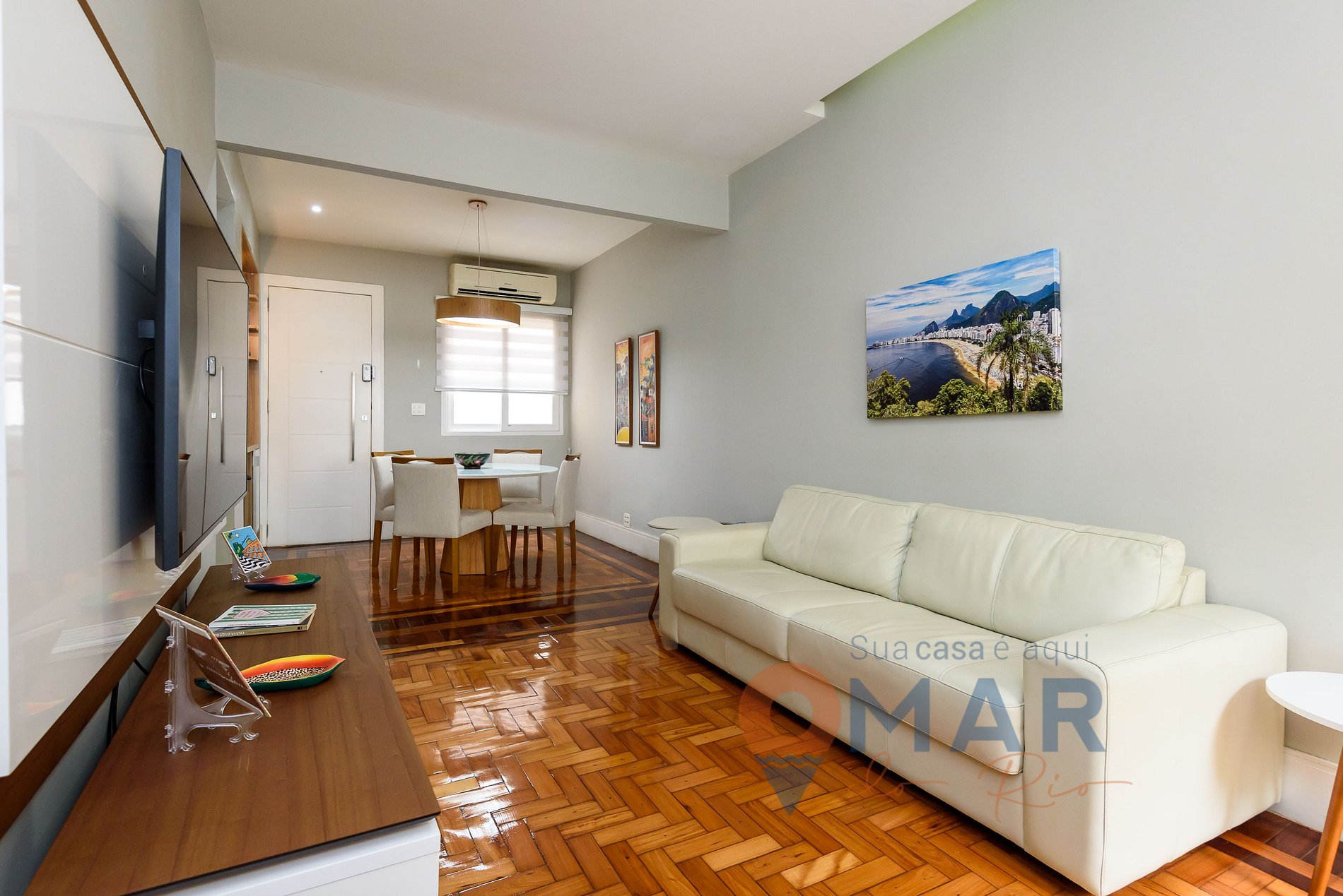 Living room: sofa, split air conditioning, Smart TV with cable channels (Claro TV), dining table with chairs, puffs and translucent curtain.