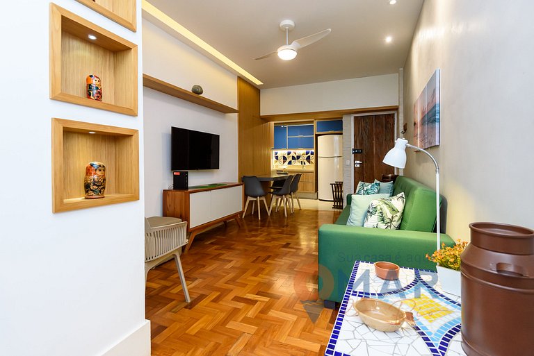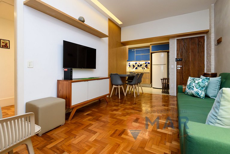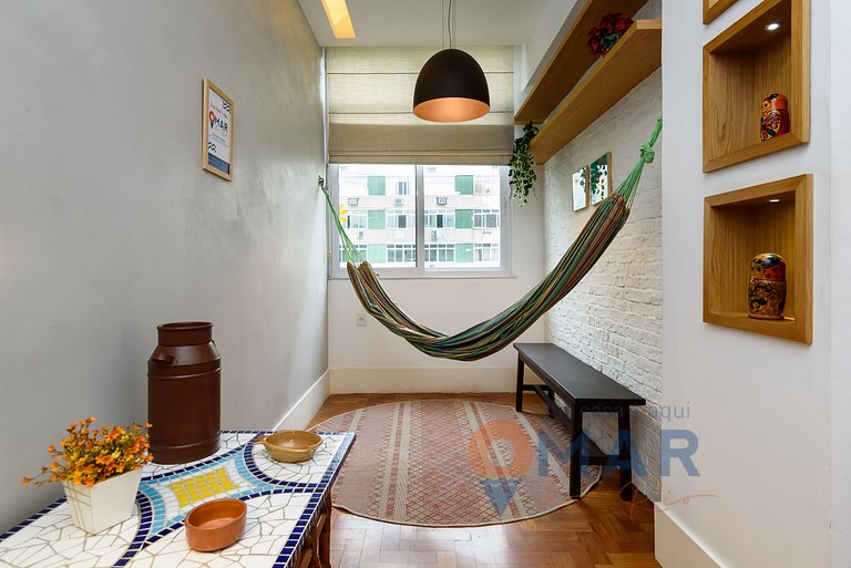 Experience this spacious decorated apartment, just 250 meters from Copacabana Beach, 450 meters from Arpoador Beach and 750 meters from Ipanema Beach. Its location is a plus, close to the region's main beaches, as well as bars, restaurants, markets, pharmacies and gyms. The property has 500 Mbps internet, air conditioning, Smart TV with cable channels, workstation, equipped kitchen, washing machine, hammock, garage and various other amenities.