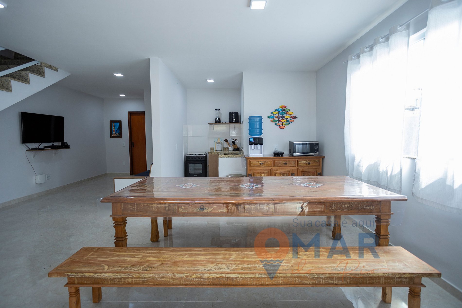 Living room (1st floor): Sofa, Smart TV, fan, dining table with benches for 8 people.