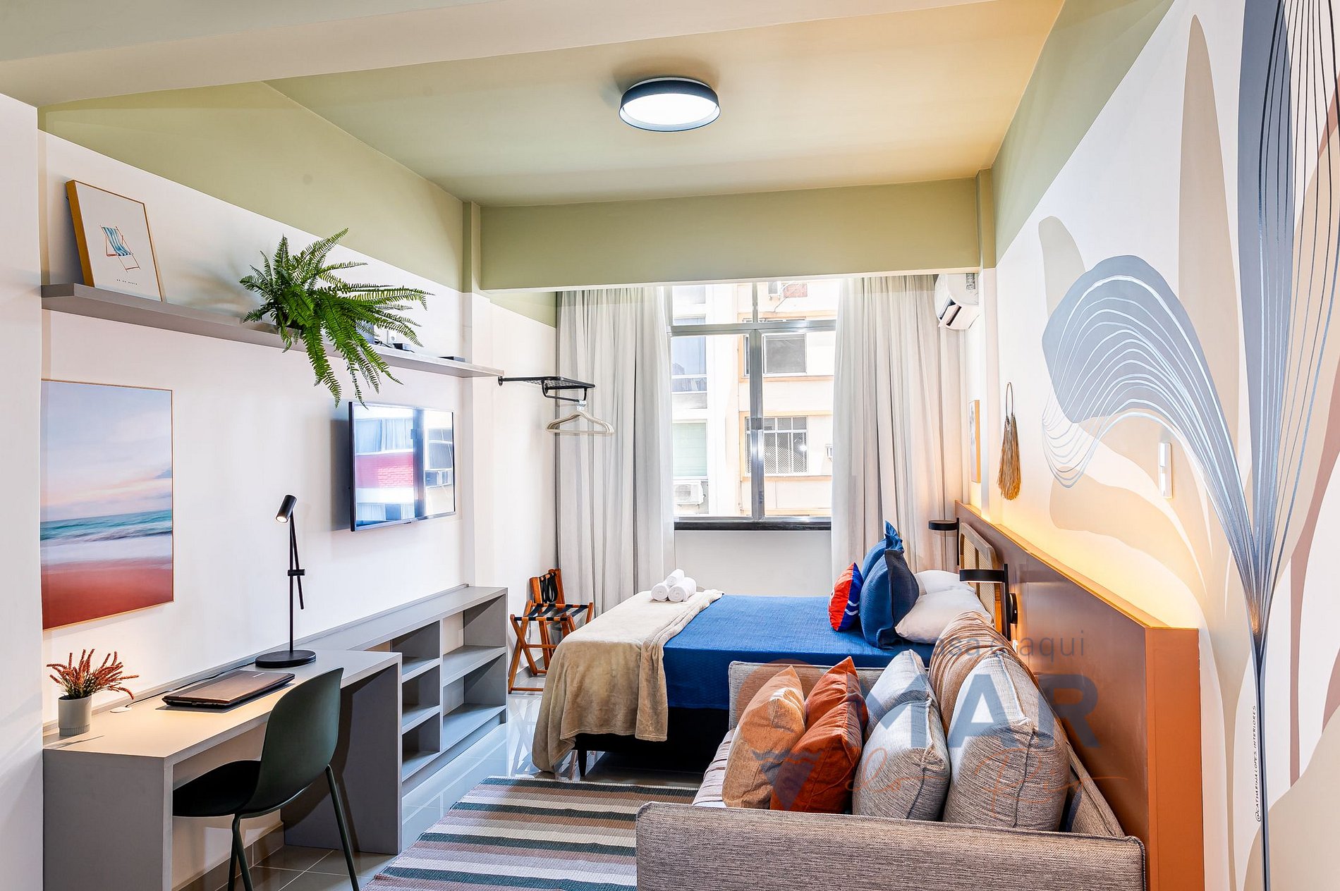 Studio: Queen size bed (198cm x 158cm), sofa bed (188cm x 138cm) - for children only, split air conditioning, Smart TV with cable channels (Claro TV), workstation, clothes rack, 2 luggage racks and a bench with 4 stools for meals.