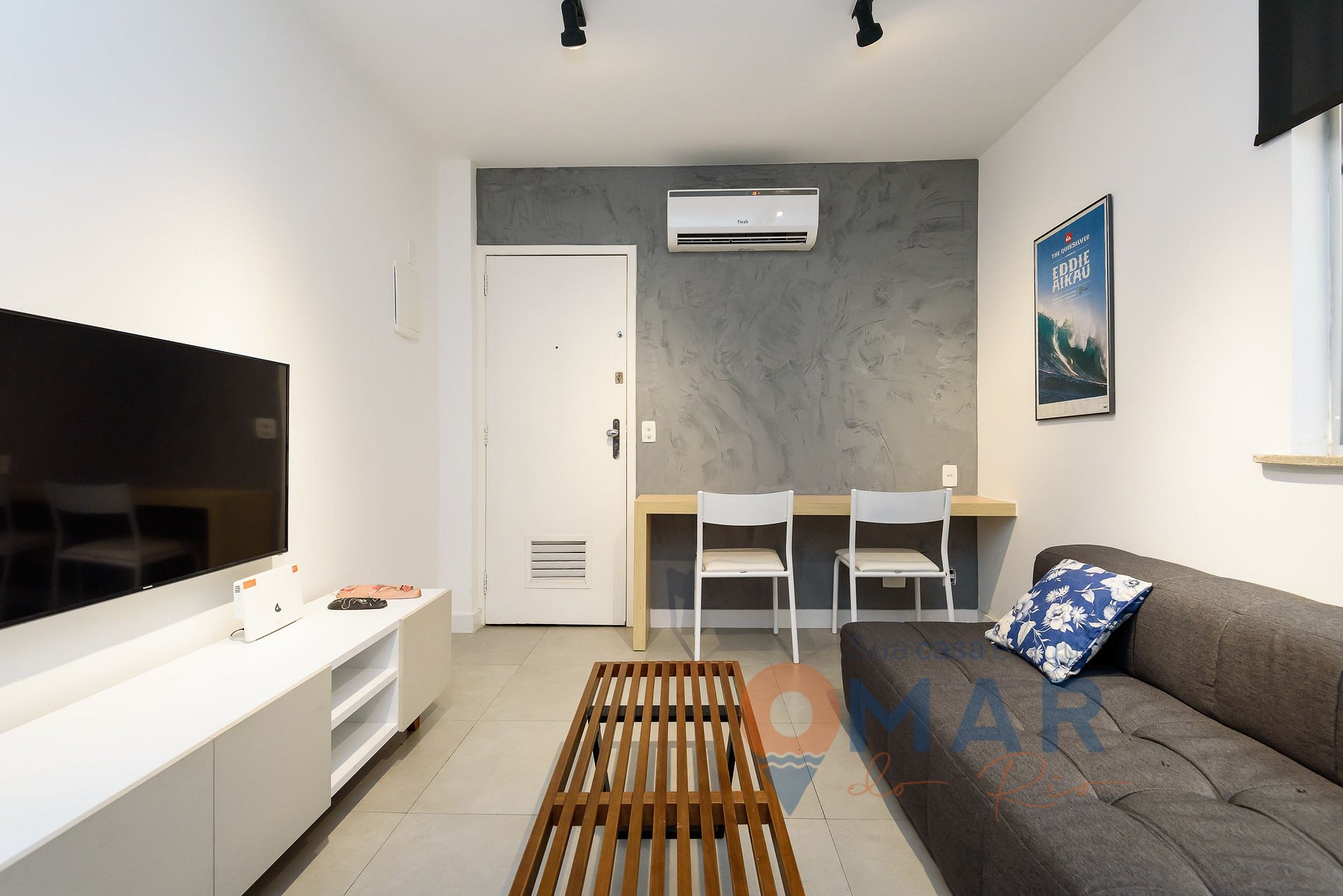 Living room: Sofa bed, split air conditioning, curtain, bench with seats, Smart TV and Alexa Echo Dot.