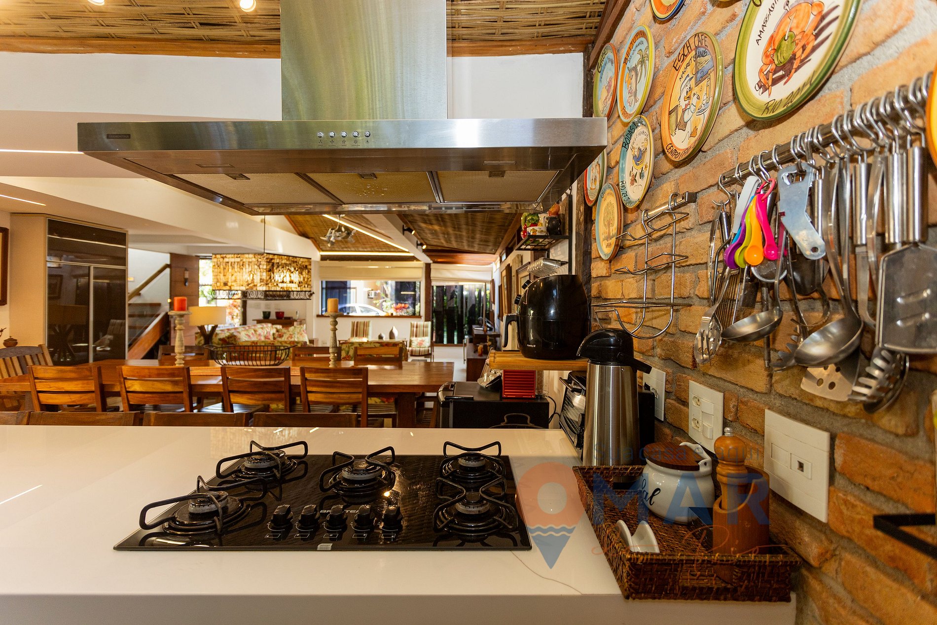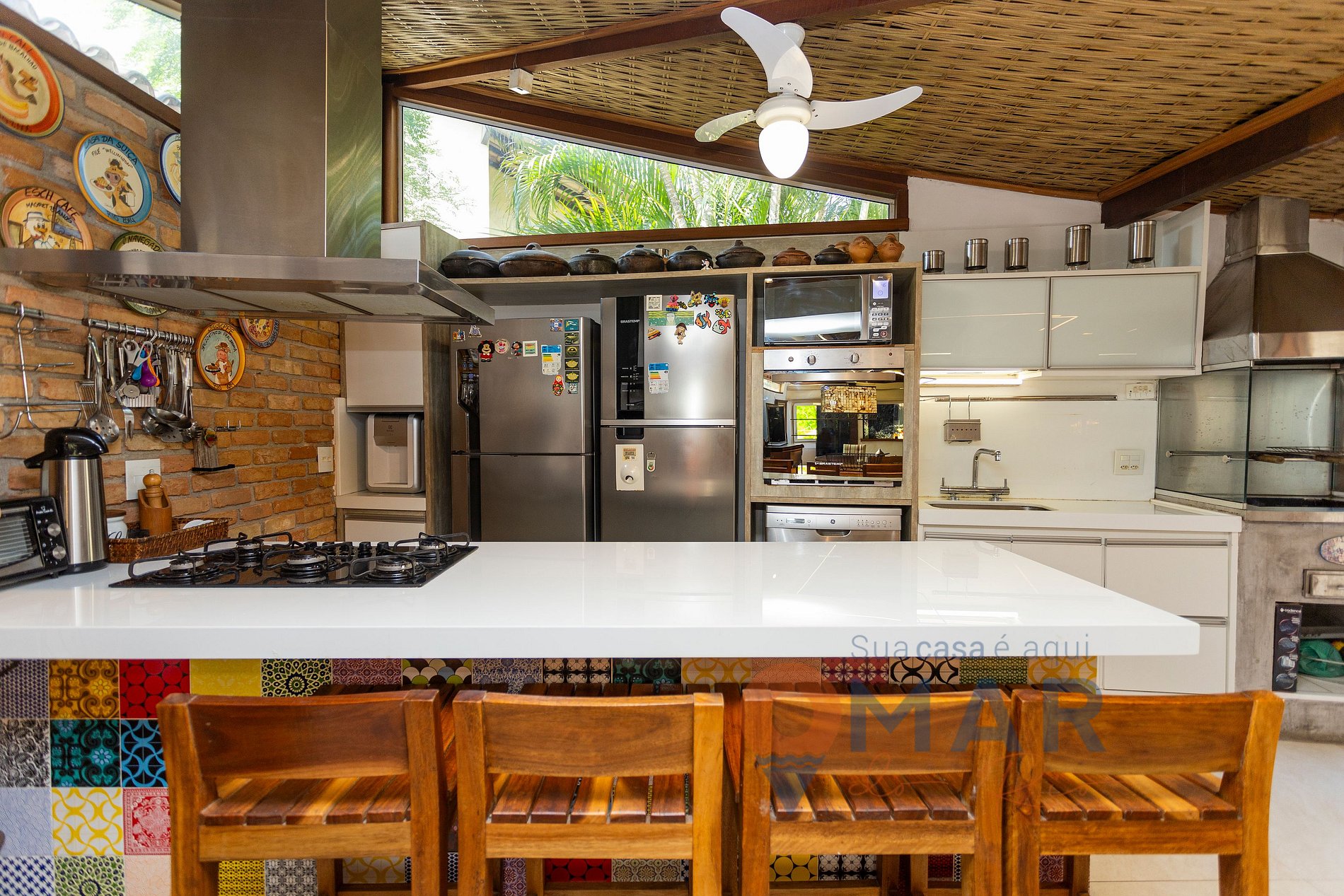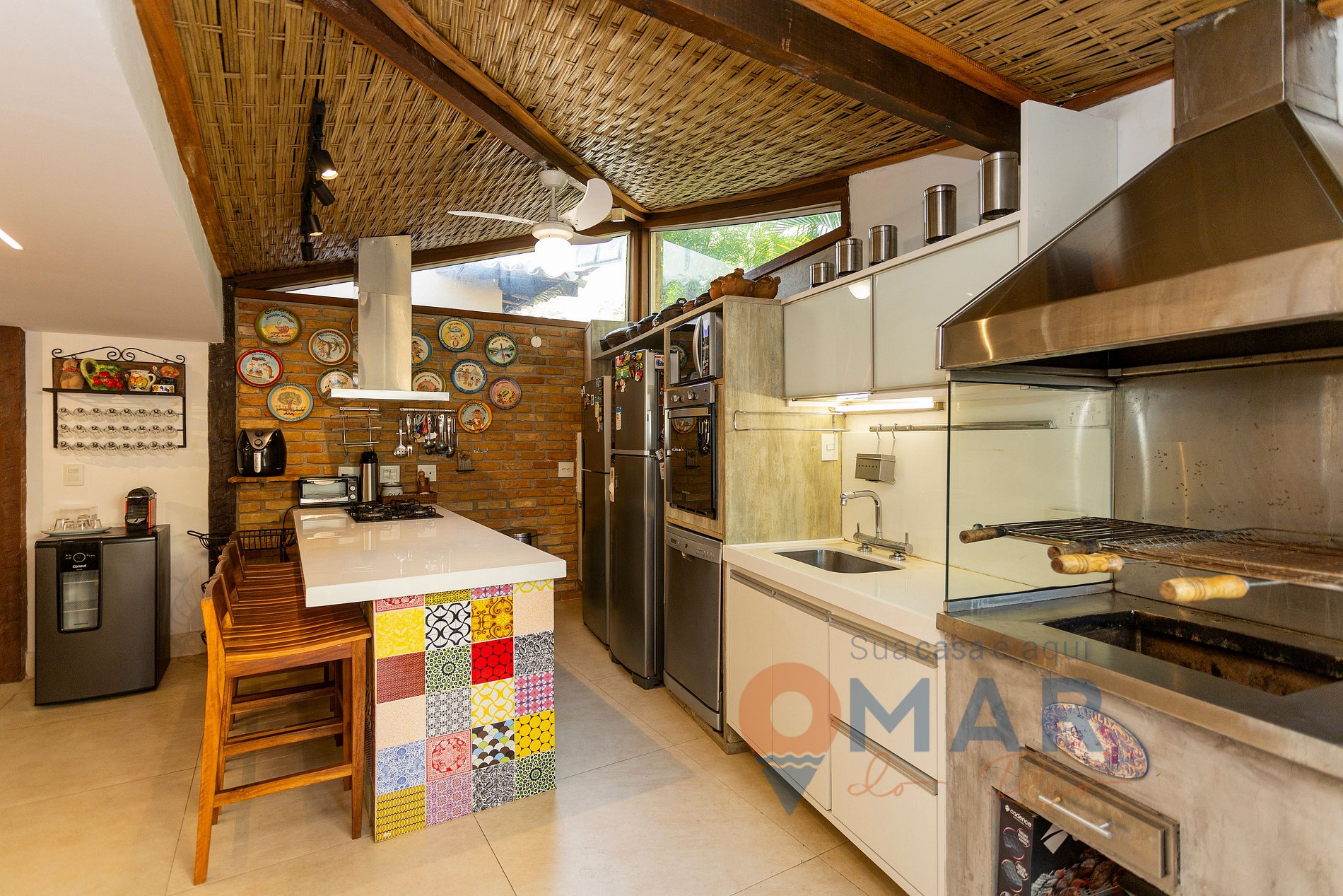 Kitchen (1st floor): 2 refrigerators, beer cooler, 5-burner cooktop, oven, microwave, barbecue grill, dishwasher, air fryer, espresso machine, kettle, electric oven, sandwich maker, toaster, electric juicer, mixer, natural or cold water dispenser, ceiling fan, and cooking utensils.