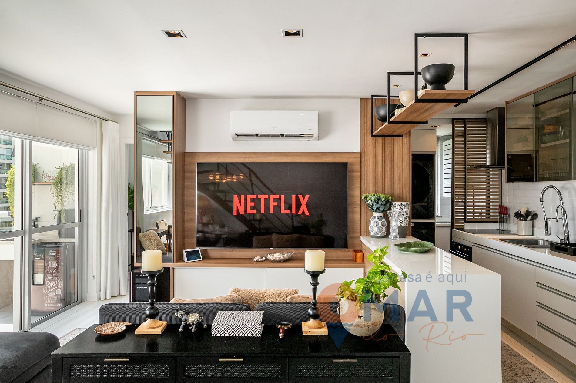 Living room: Sofa, 75" Smart TV, cable channels (Vivo TV), split air conditioning, and dining table with 4 chairs.