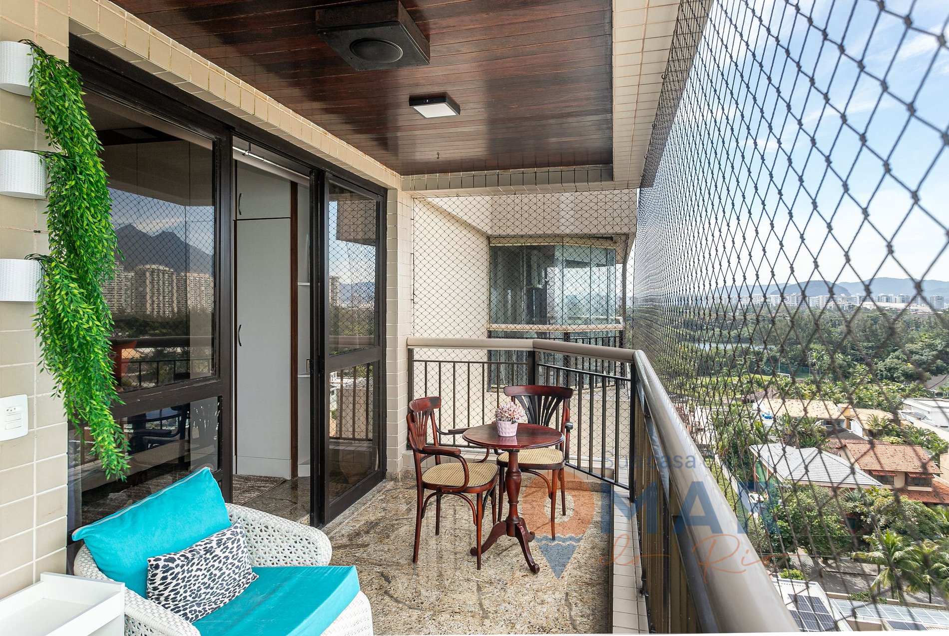 Balcony: table with chairs, armchairs, Bluetooth sound system, and protective screen.