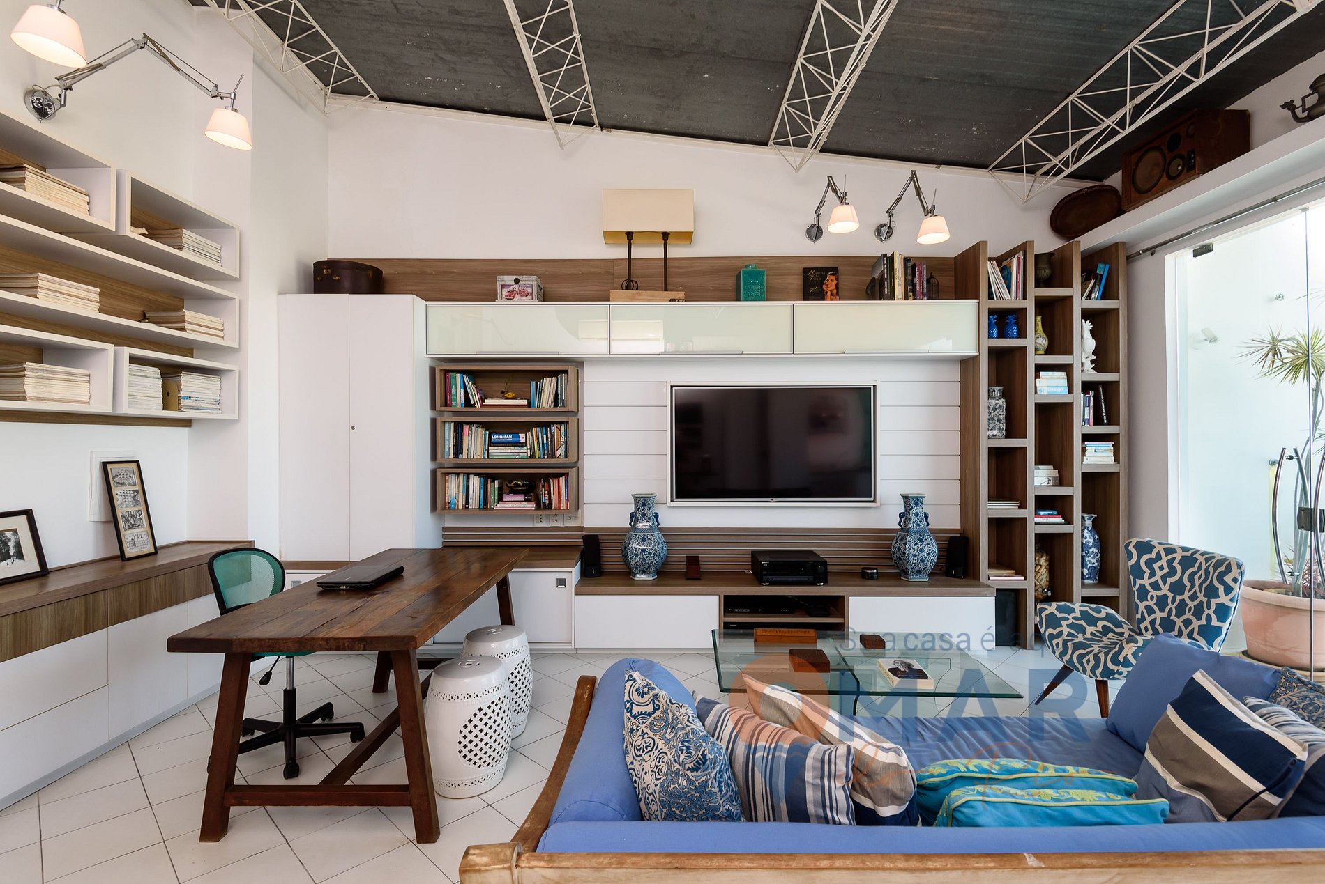 TV room: sofa, 60'' Smart TV with cable (Claro TV), split air conditioning, and workstation.
