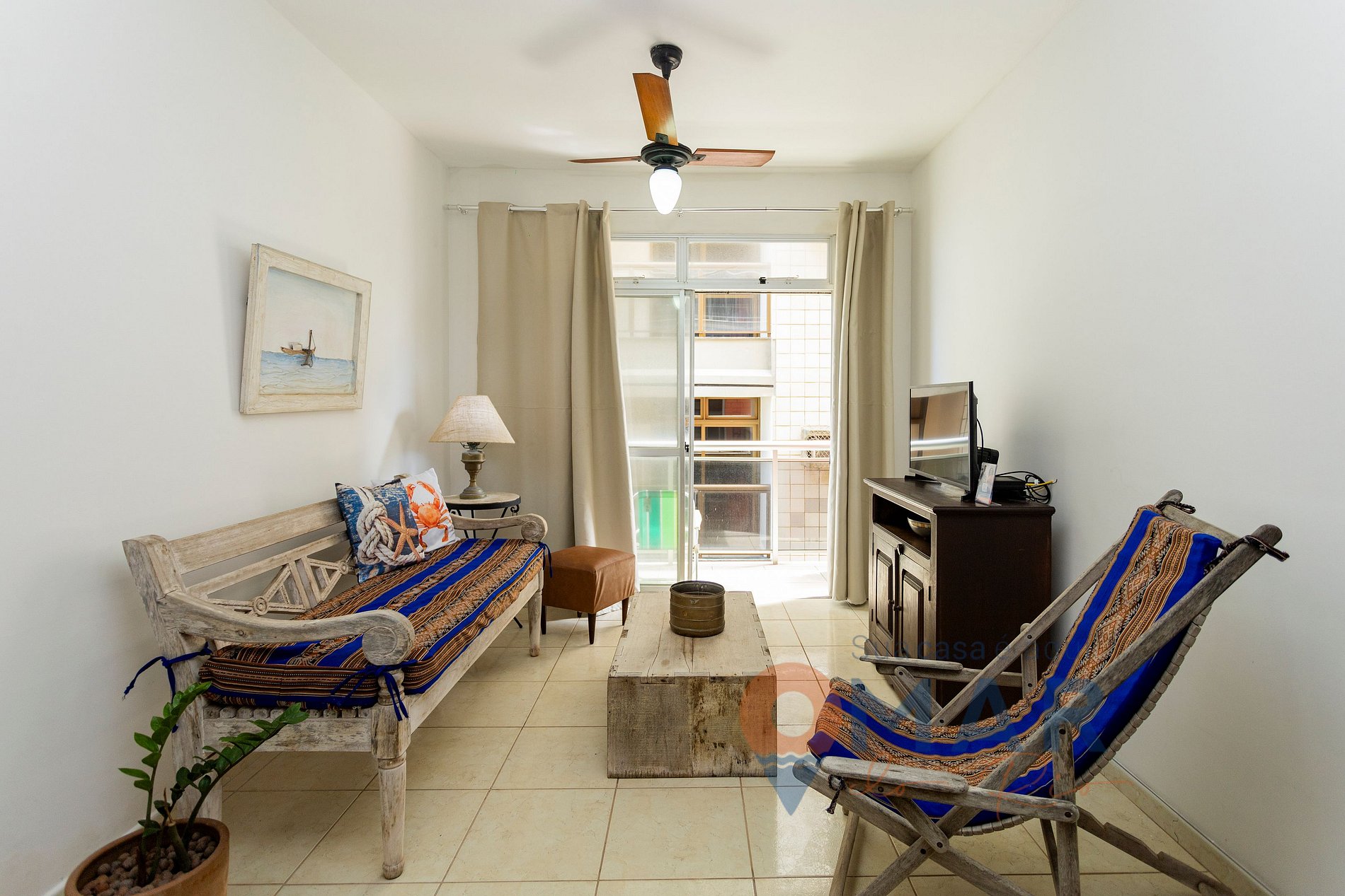 Sala: sofá, sillón reclinable, Smart TV de 32" con canales por cable (Vivo), 2 ventiladores de techo, mesa de comedor con 4 sillas, cortinas opacas.