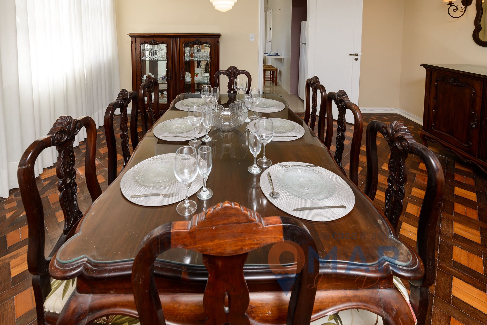 Comedor: Mesa con 8 sillas, aparador, vitrina y aire acondicionado.