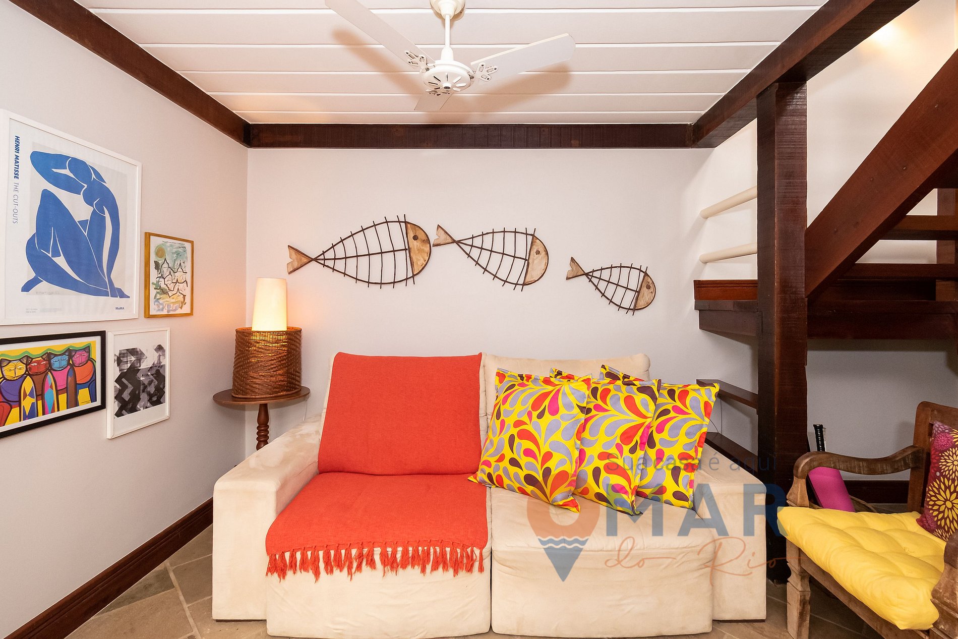 Sala de estar (1.º piso): sofá retráctil, smart TV y ventilador de techo.