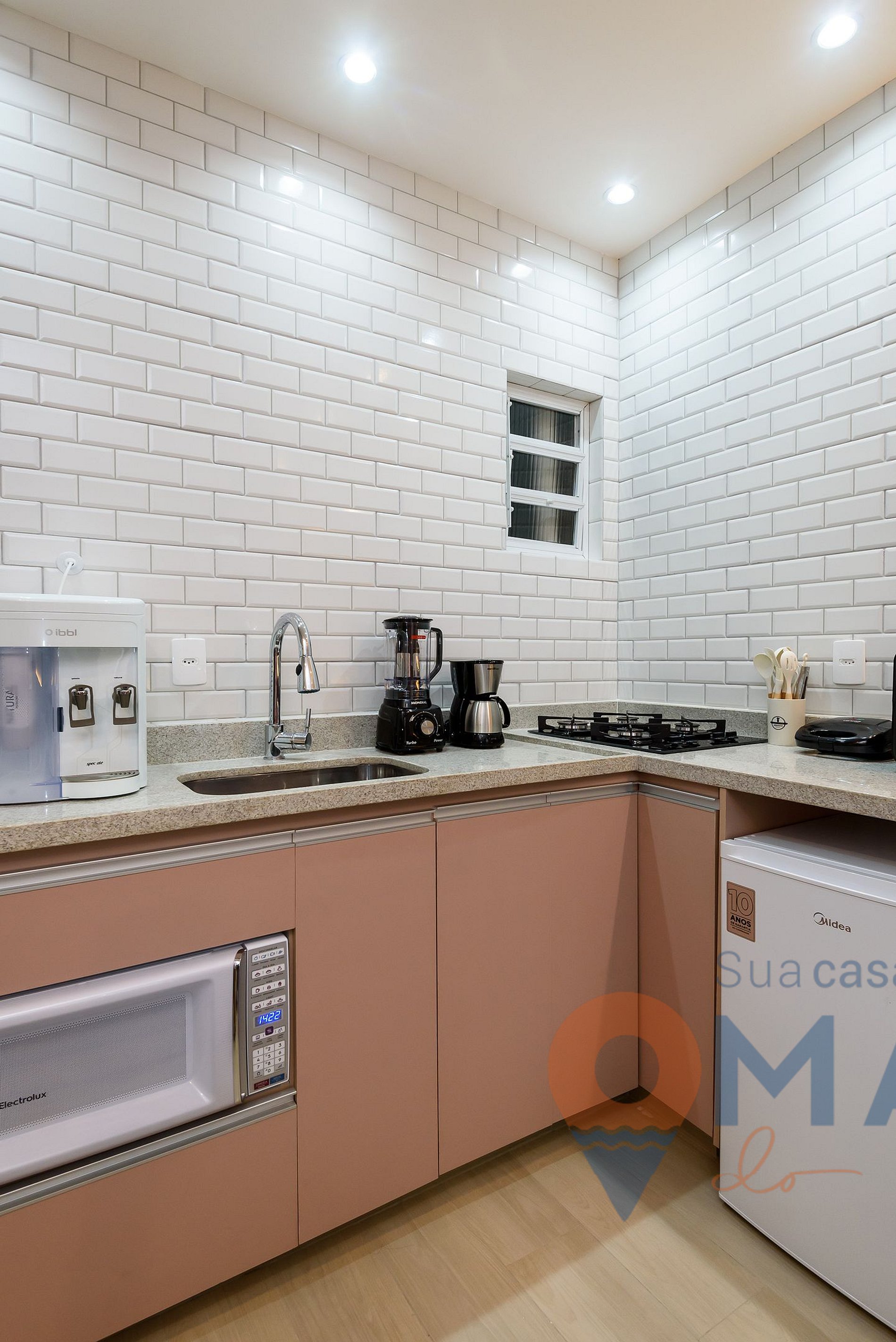 Cocina: minibar, estufa de 4 quemadores, microondas, freidora sin aceite, purificador de agua con agua fría y natural, cafetera eléctrica, licuadora, sandwichería, exprimidor de naranjas y utensilios de cocina.