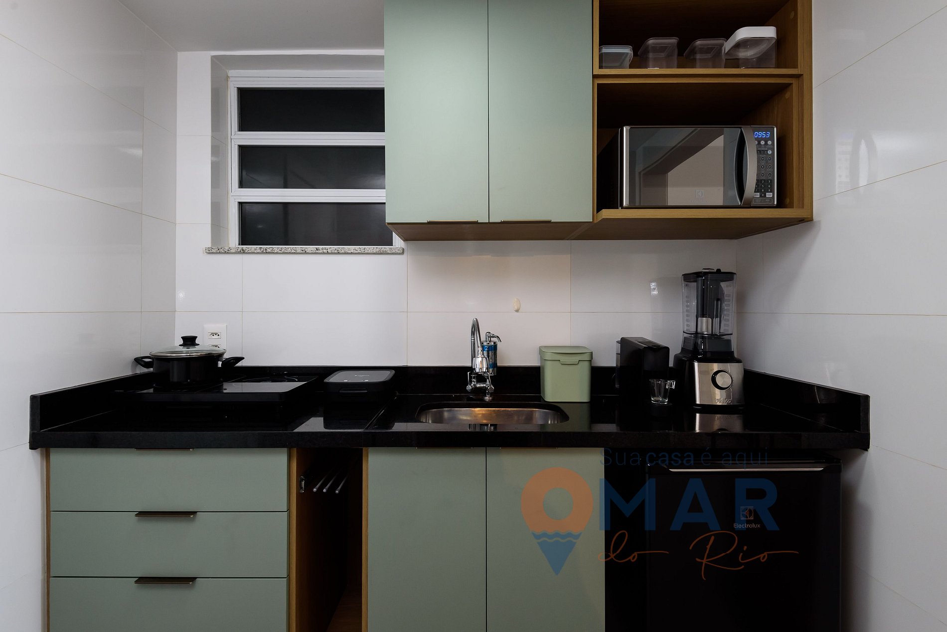 Cocina: minibar, cocina de 2 fuegos, microondas, cafetera Nespresso, filtro de agua del grifo, licuadora, sandwichera, copas de vino y utensilios de cocina.