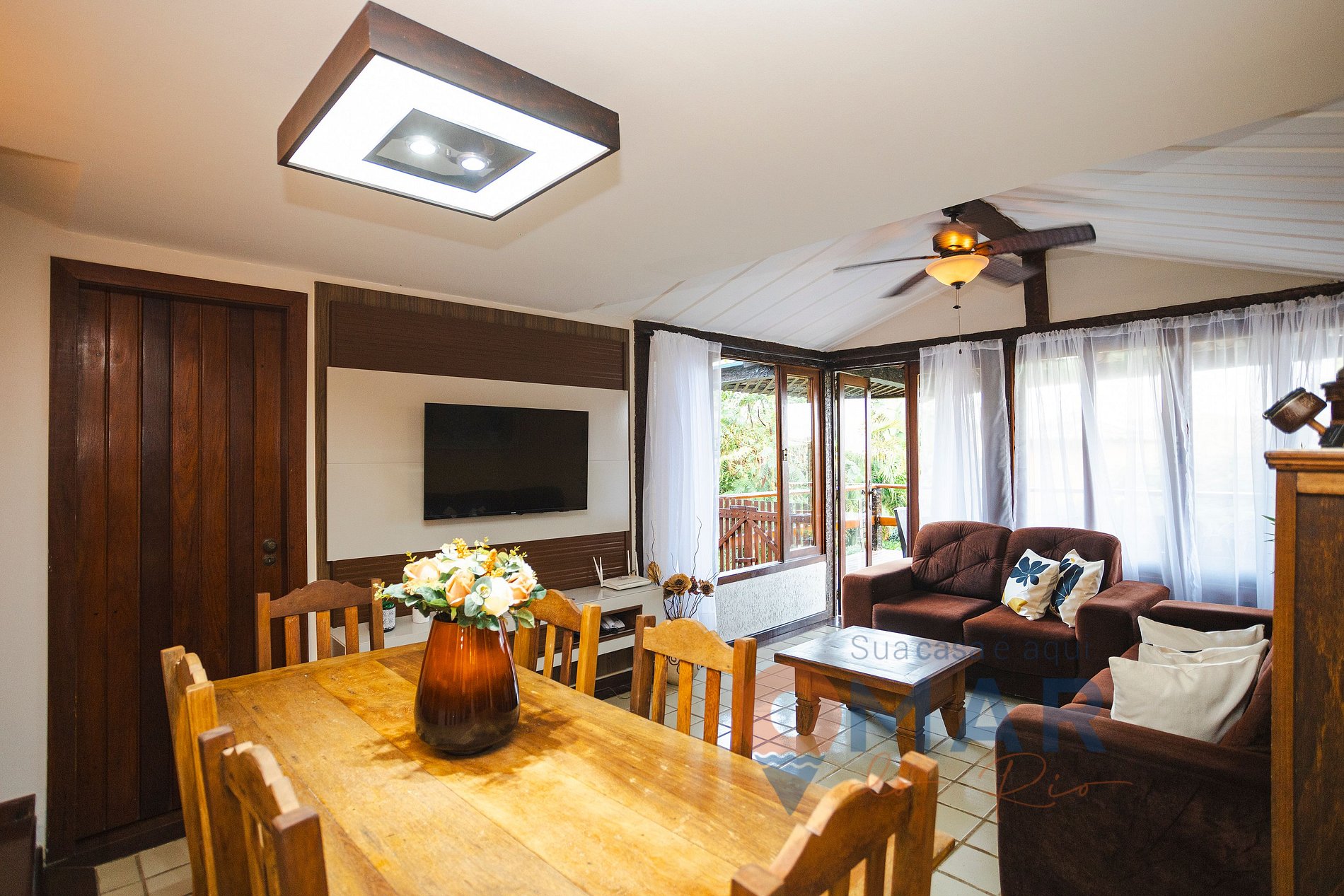 Sala (1.º piso): sofás, smart TV, ventilador de techo, mesa de comedor con 6 sillas y balcón con hamaca.