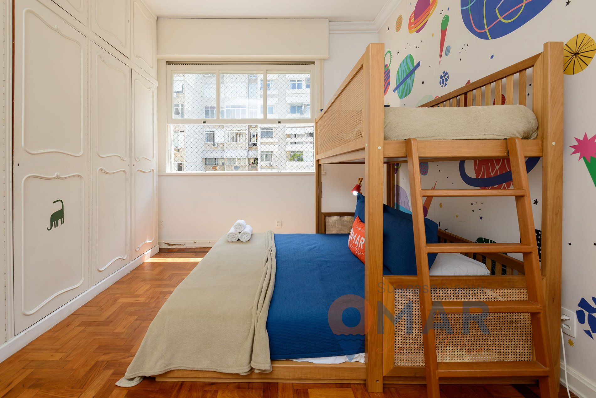 Habitación infantil: cama king (1,85x1,88cm), aire acondicionado split, mosquitera y persiana enrollable.