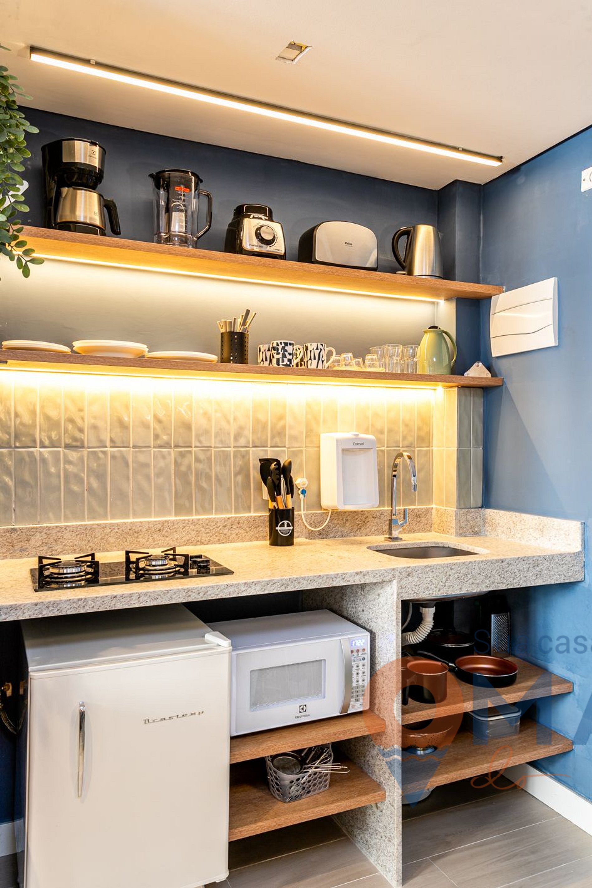 Cocina: Frigobar, placa de cocina, microondas, batidora, tostadora, ollas y sartenes, filtro de agua, cafetera y utensilios de cocina.
