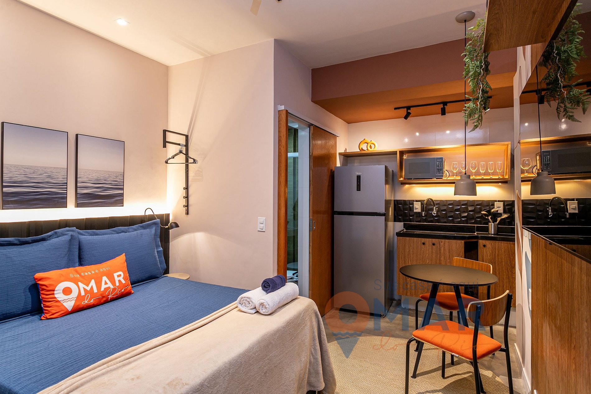 Estudio: cama de matrimonio estándar (188cm x 138cm), aire acondicionado, cortina blackout, perchero, portaequipajes, smart TV de 50, espejo de cuerpo entero iluminado.