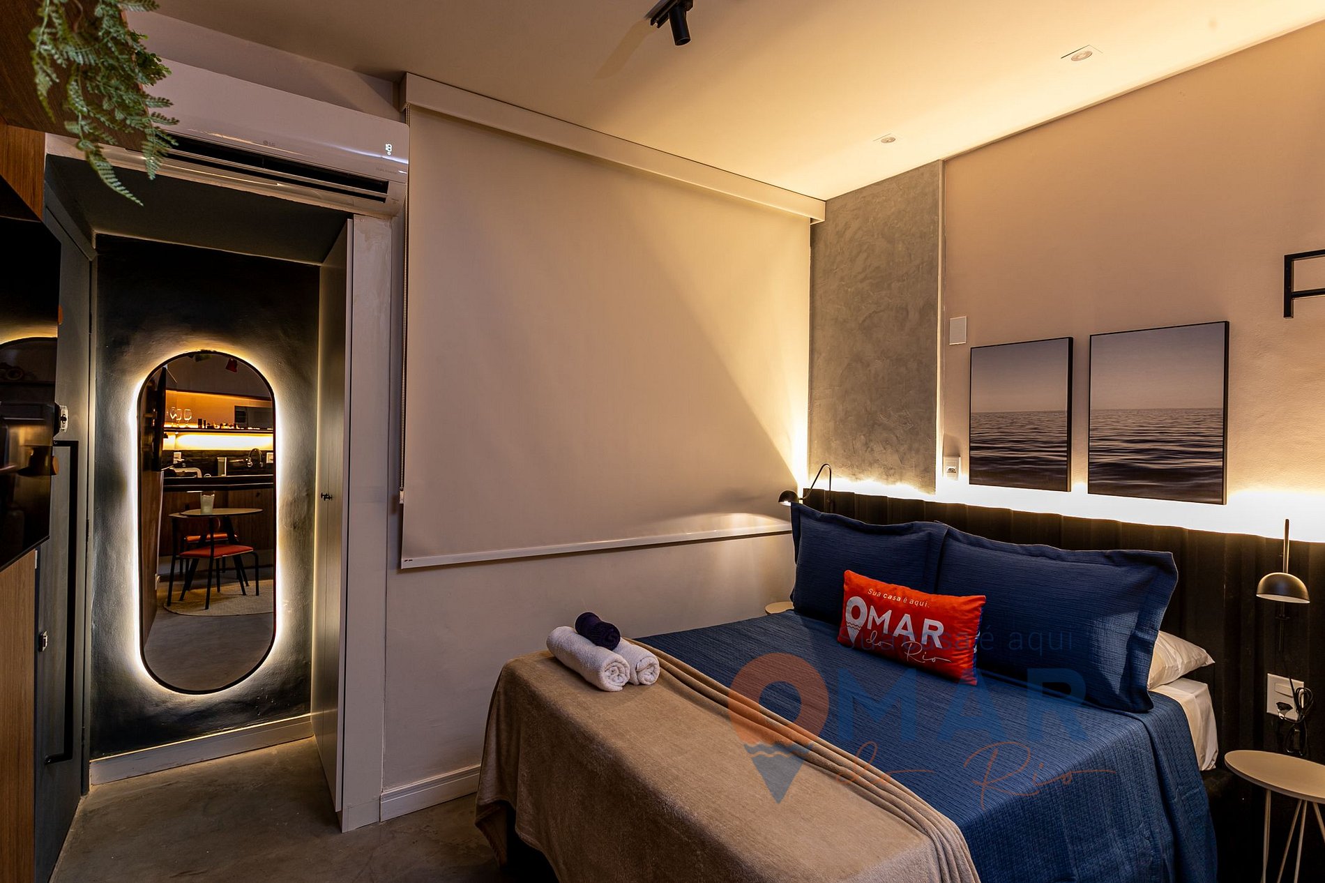 Estudio: cama de matrimonio estándar (188cm x 138cm), aire acondicionado, cortina blackout, perchero, portaequipajes, smart TV de 50, espejo de cuerpo entero iluminado.