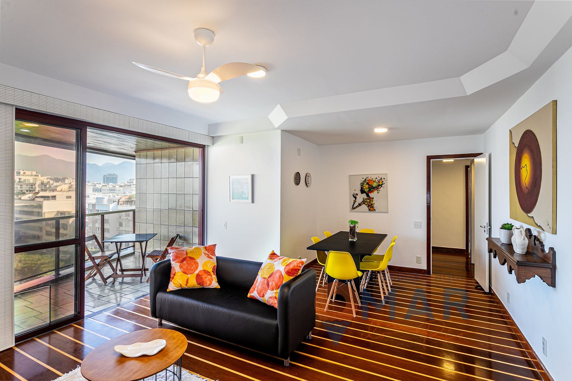Salón: Sofá, Smart TV con canales en abierto (antena), ventilador de techo, cortina, sillón, mesa de comedor con 6 sillas, espejo y balcón con mesa y 2 sillas.