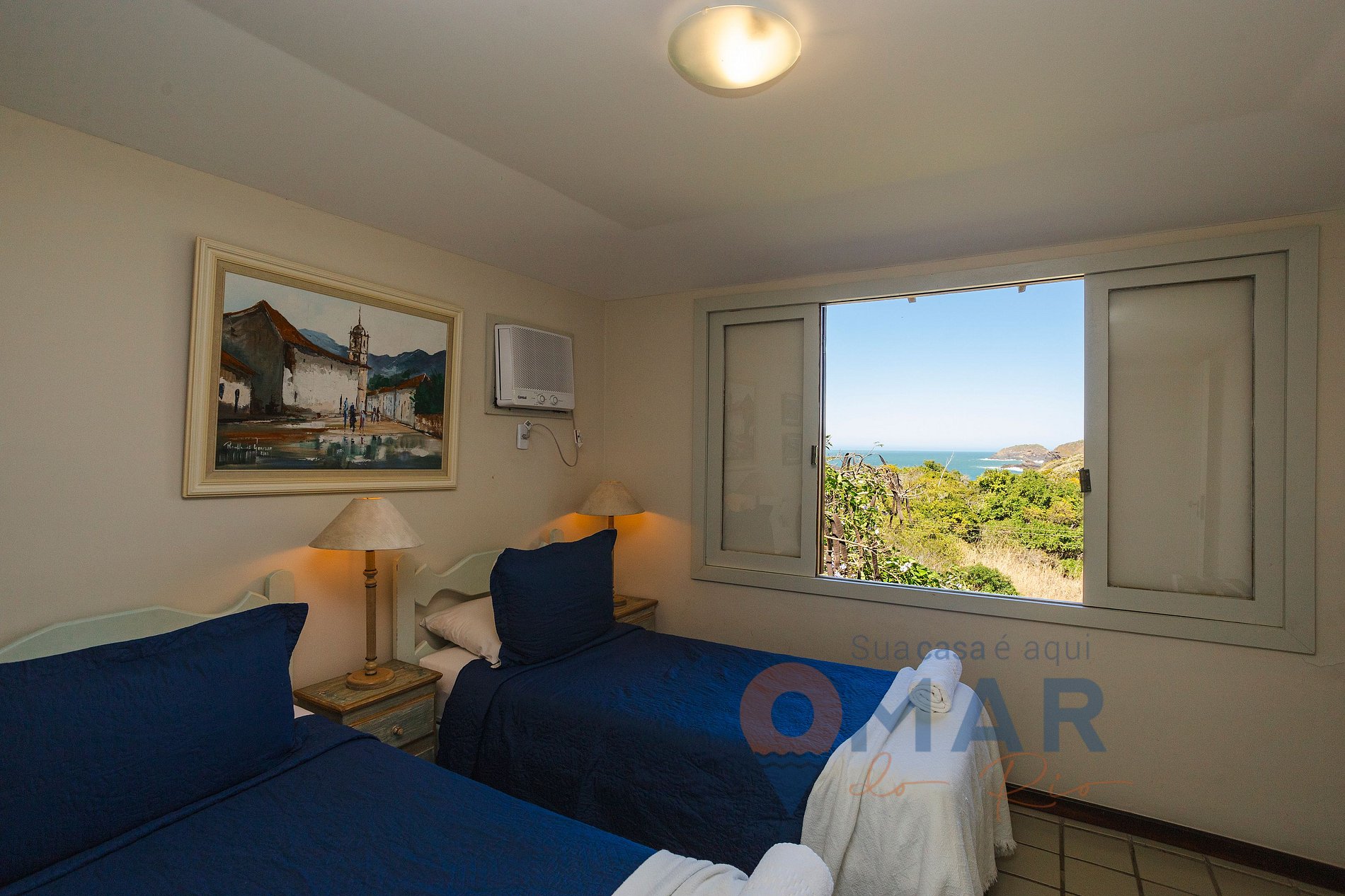 Segunda suite con vista al mar desde la ventana (2.º piso): 2 camas de soltero (188 cm x 88 cm), aire acondicionado, estantes y maletero para guardar la ropa.