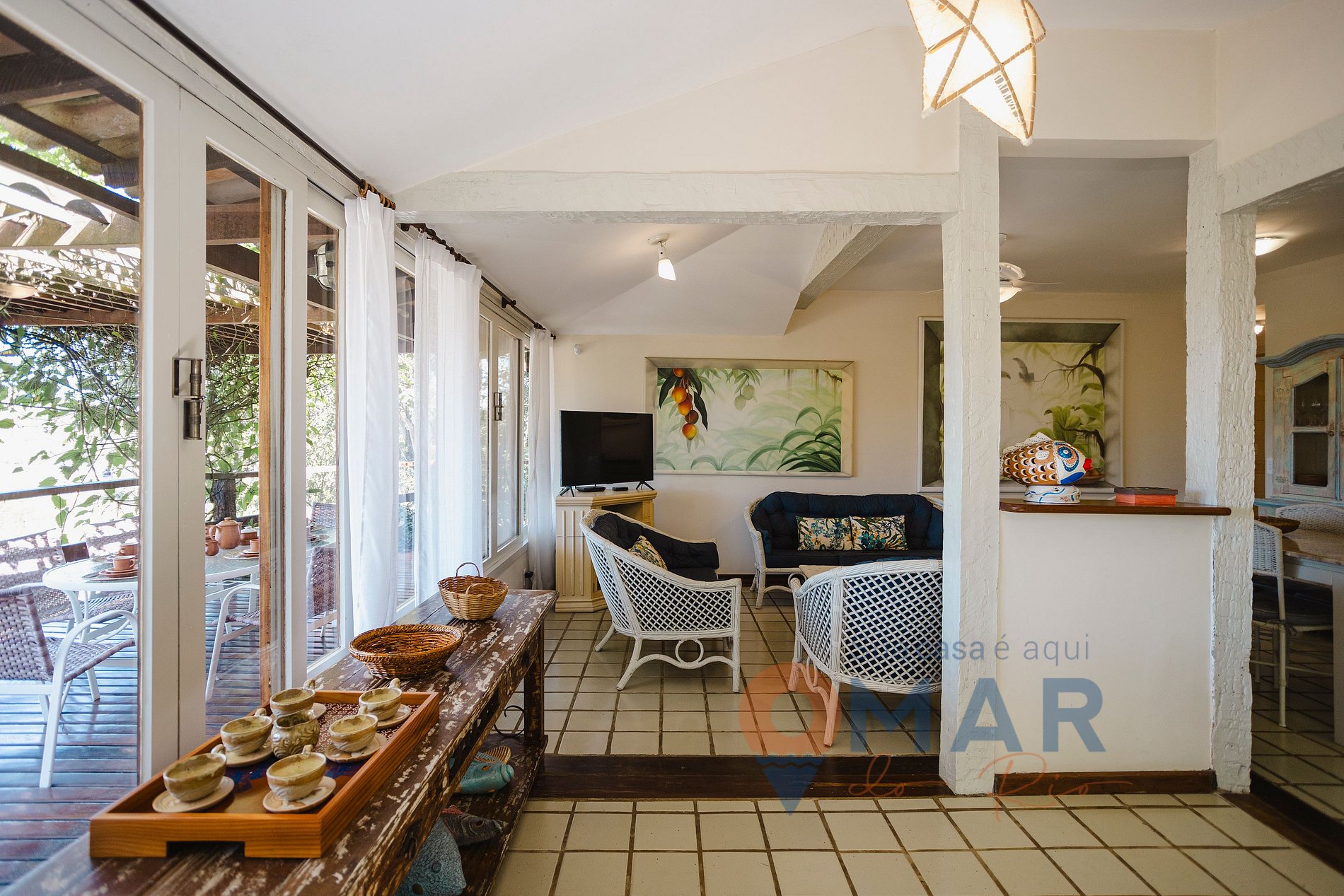 Sala (1.º piso): sofás, sillones, Smart TV con canales abiertos, ventilador de techo, mesa de comedor con sillas, cortina translúcida, hamaca y mosquitero en la ventana.