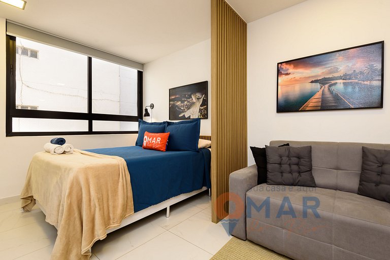Estudio: cama doble estándar (188cm x 138cm), sofá, aire acondicionado split, Smart TV de 50" con canales en abierto (antena digital), estación de trabajo, mesa de trabajo con 2 taburetes, armario con perchas, cortina blackout y espejo de cuerpo entero.