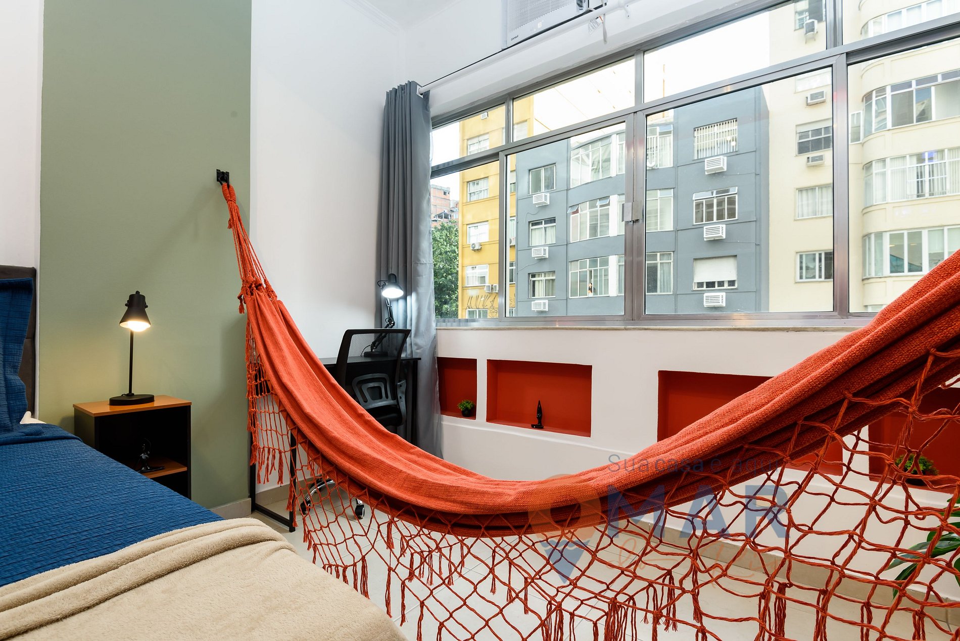 Estudio: cama Queen size (198cm x 158cm), aire acondicionado, cortina blackout, armario con perchas, Smart TV de 50» con canales en abierto (antena), estación de trabajo, hamaca y espejo de cuerpo entero.